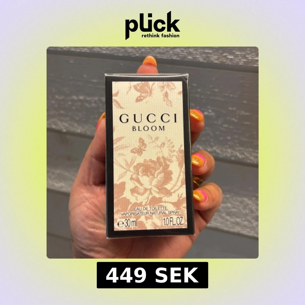 Gucci Bloom Eau de Toilette i 30 ml flaska. Förpackningen är beige med blommigt och fjärilsmönster i ljusrosa toner och svarta kanter. En feminin och elegant parfym med stilren design, perfekt för dig som gillar lyxiga dofter.