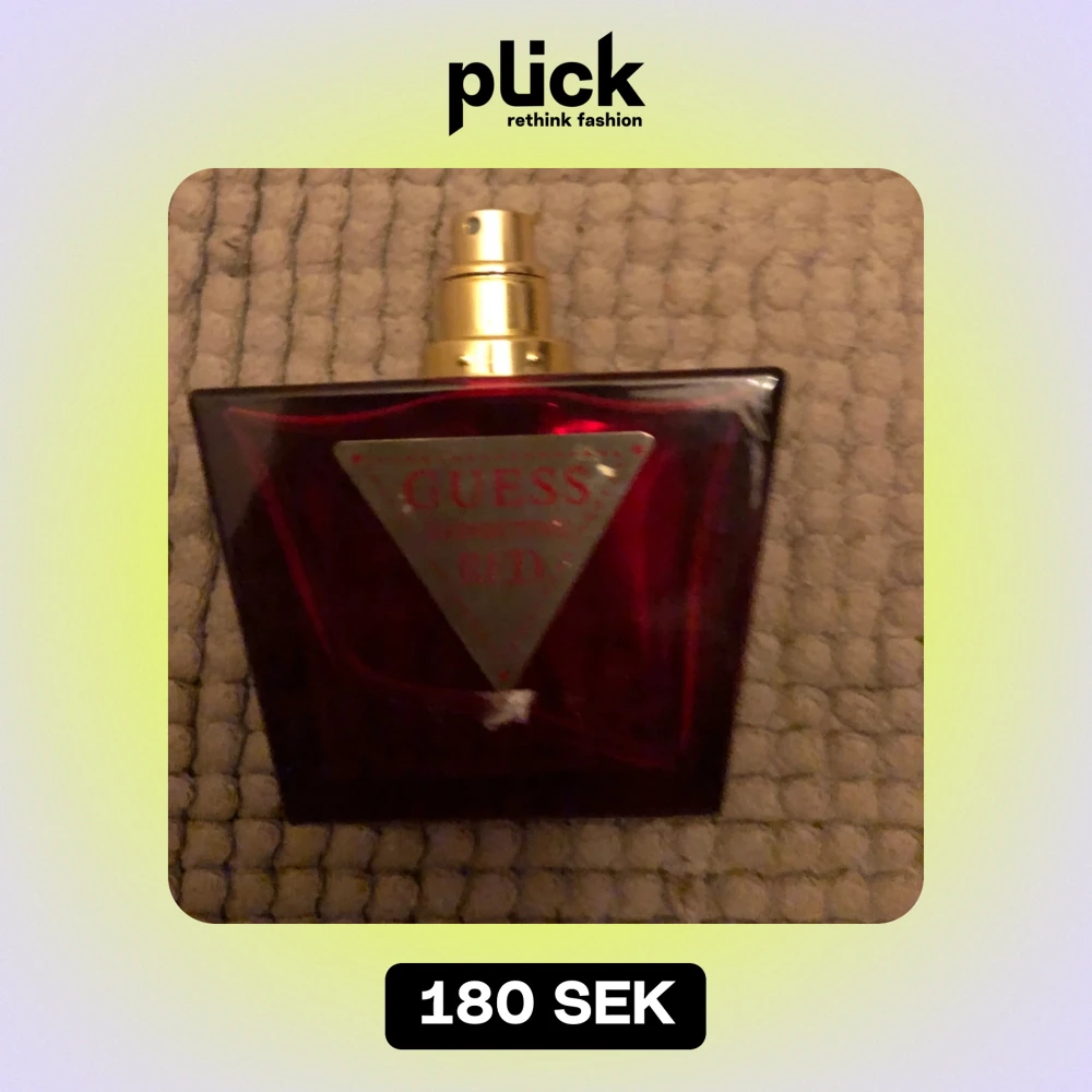 Säljer en elegant parfym från Guess i en djup röd flaska med en triangulär etikett.