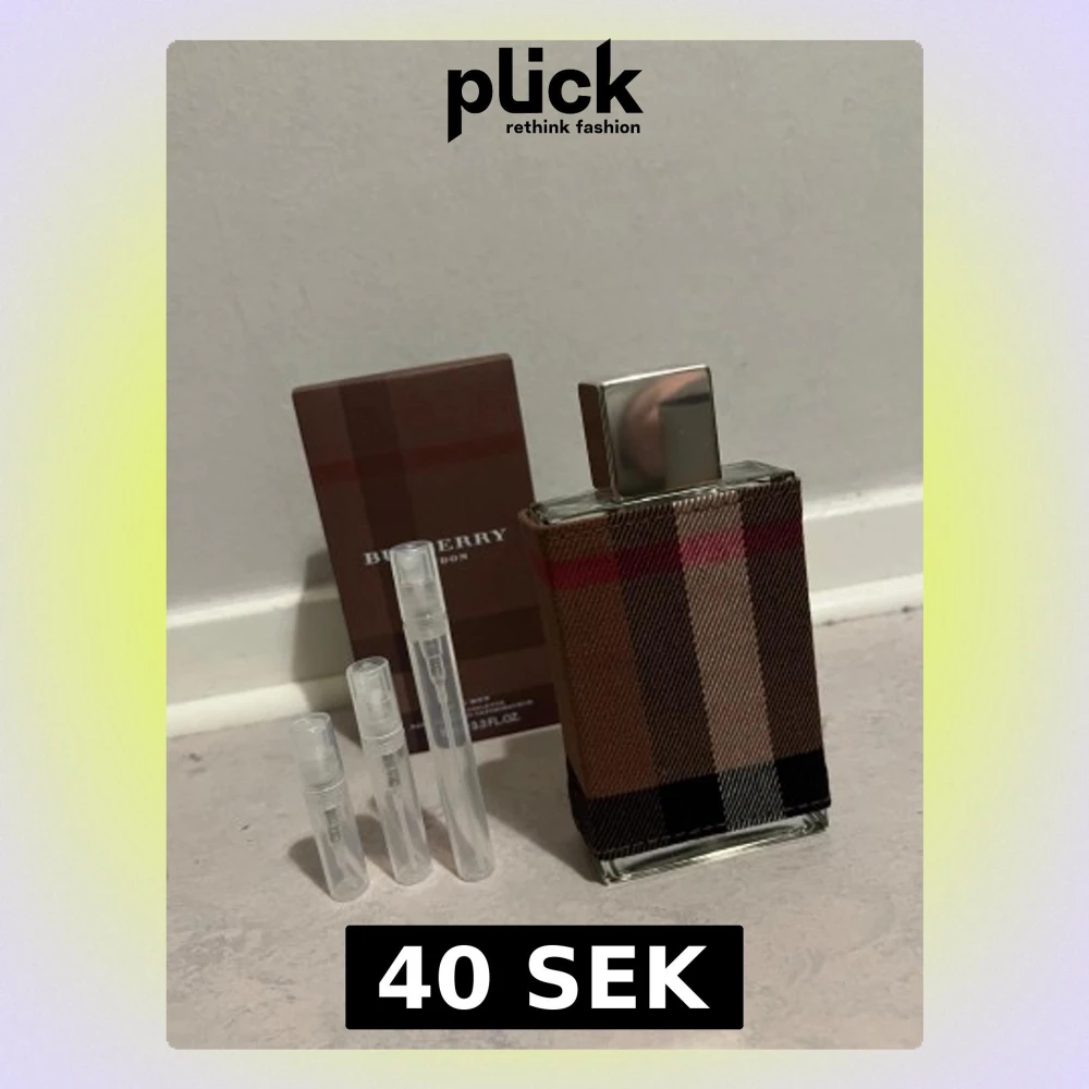 Stilren Burberry parfym i klassiskt rutigt fodral. Levereras med originalkartong och tre praktiska testprover. Volym: 3.3 FL.OZ. Perfekt för dig som vill ha en ikonisk doft i samlingen. 2ml=20kr 3ml=25kr 5ml=40kr