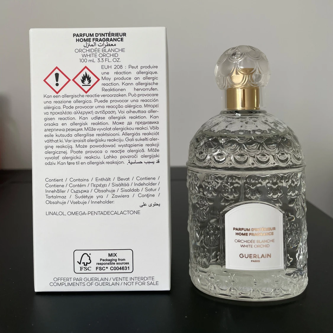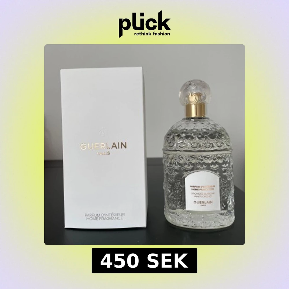Lyxig inredningsparfym från Guerlain, Orchidee Blanche (White Orchid), 100 ml. En spray används för att testa hemdoften. Köpte den från Guerlain-butiken. Flaskan är genomskinlig med vackert mönstrat glas och rund, dekorativ kork i plast och guld. Kommer i elegant vit kartong med gulddetaljer. Perfekt för att ge hemmet en exklusiv doft.