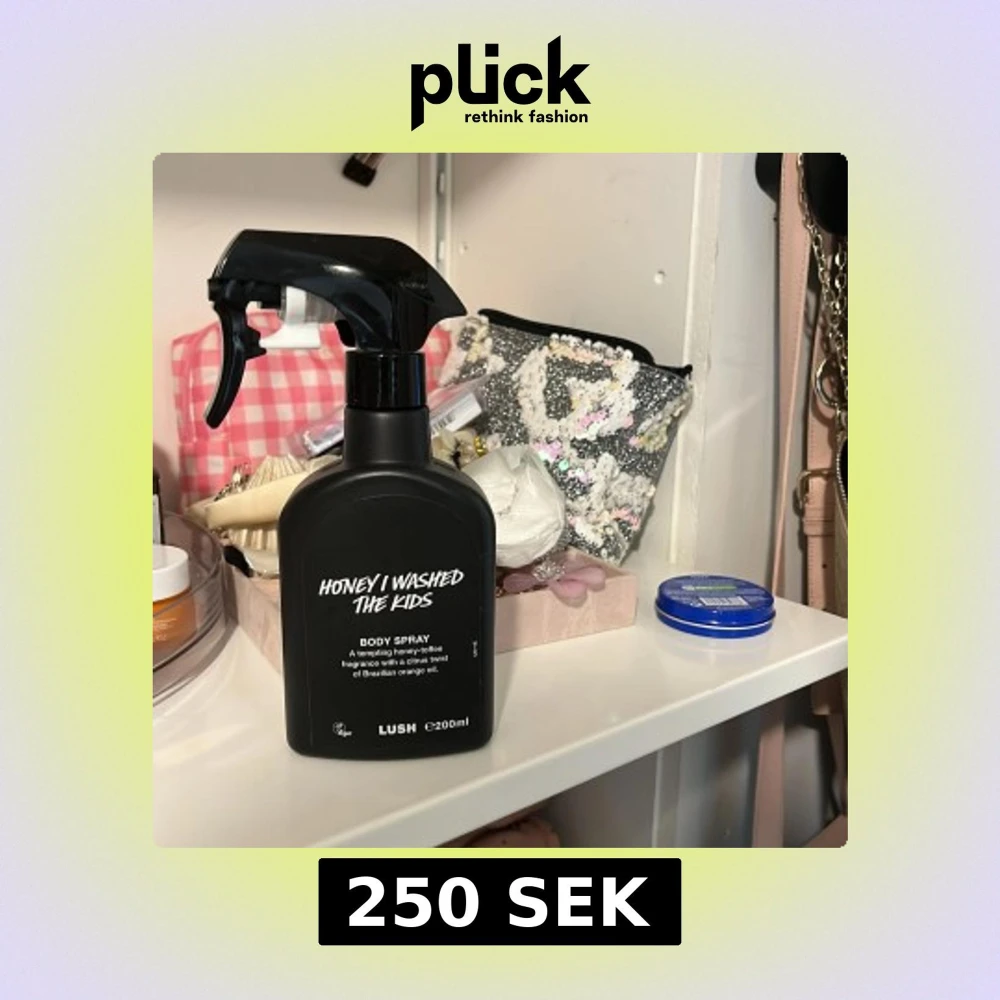 En svart sprayflaska med body spray från Lush, doften heter Honey I Washed The Kids. Flaskan rymmer 200 ml och har en enkel, modern design med vit text. Produkten ger en söt och varm doft av honung och karamell. helt ny oanvänd