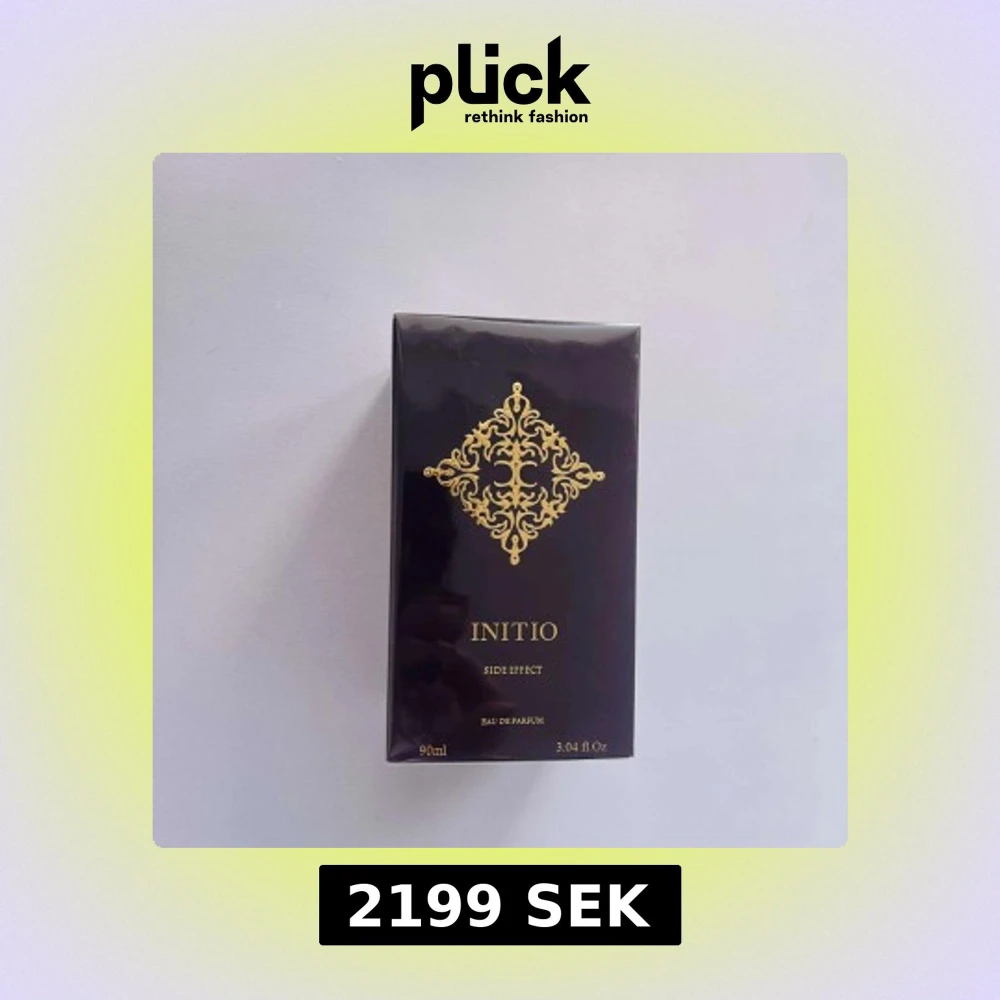 Initio Side Effect Eau de Parfum i lyxig svart kartong med gulddetaljer. Flaskan rymmer 90 ml och har en elegant, exklusiv design med dekorativt mönster på framsidan. Perfekt för dig som gillar unika och sofistikerade dofter. Har redan öppnat!