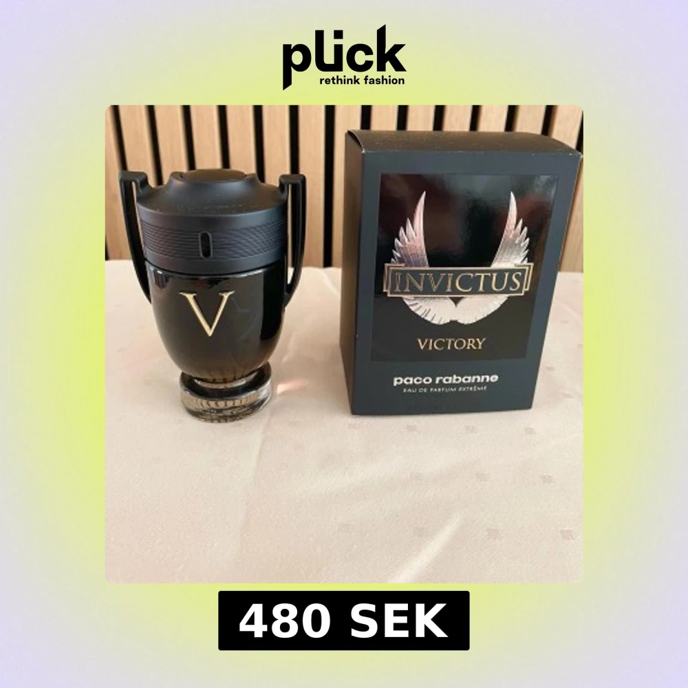 Säljer en flaska Invictus Victory Eau de Parfum Extrême från Paco Rabanne. Flaskan har en unik design som liknar en trofé i svart med ett stort 'V' på framsidan. Doften är intensiv och maskulin, perfekt för den som vill sticka ut.
