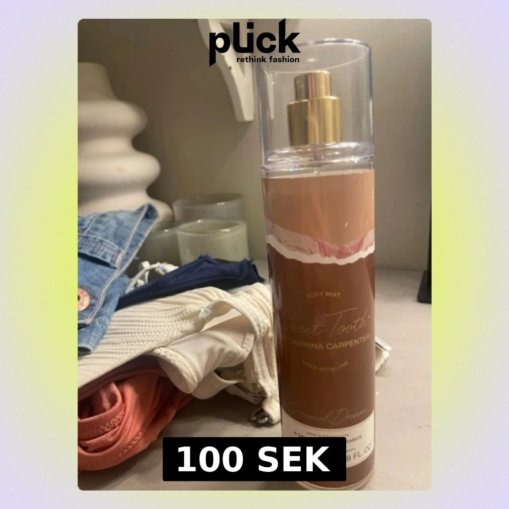 Sweet Tooth Body Mist från Sabrina Carpenter i doften Caramel Dream. Flaskan är cylindrisk och genomskinlig med guldfärgad spraypump och lock. Designen har bruna och vita toner med elegant text. Innehåller 236 ml och ger en söt, karamellaktig doft.