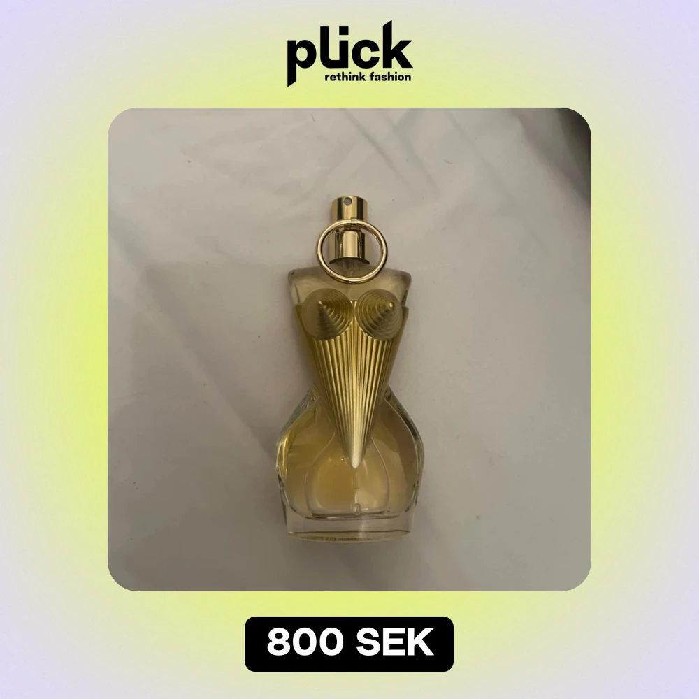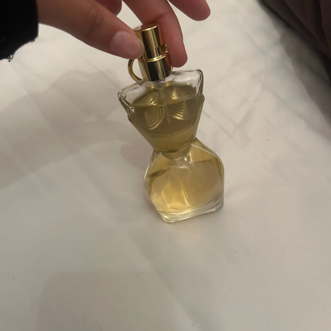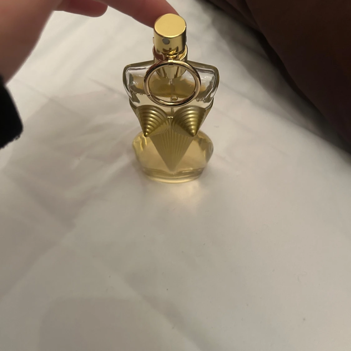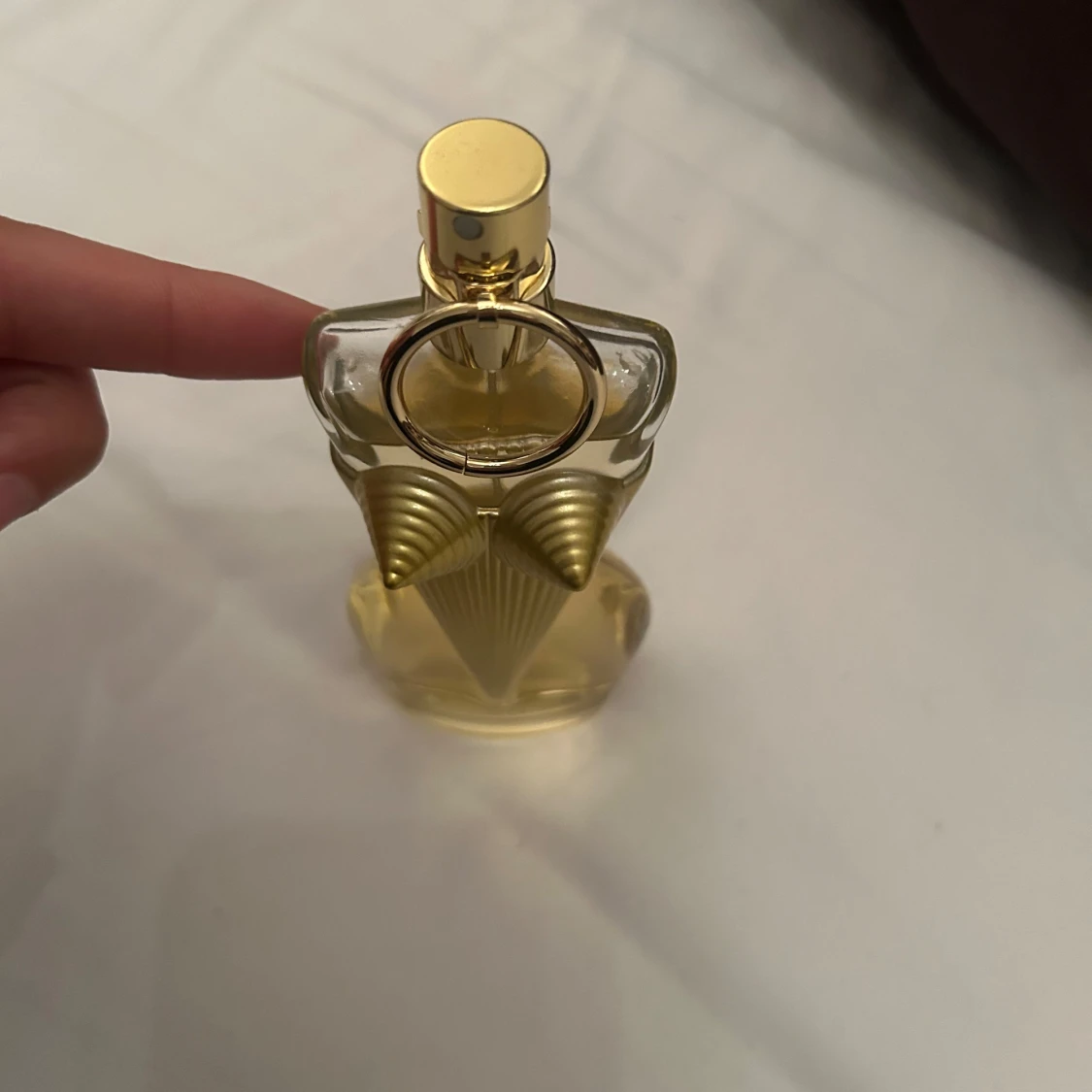 Säljer en unik parfymflaska formad som en kvinnokropp. Flaskan är genomskinlig med guldiga detaljer och en elegant design. Perfekt för den som vill ha något annorlunda på sminkbordet. Flaskan har en guldfärgad spraytopp och en dekorativ ringdetalj.