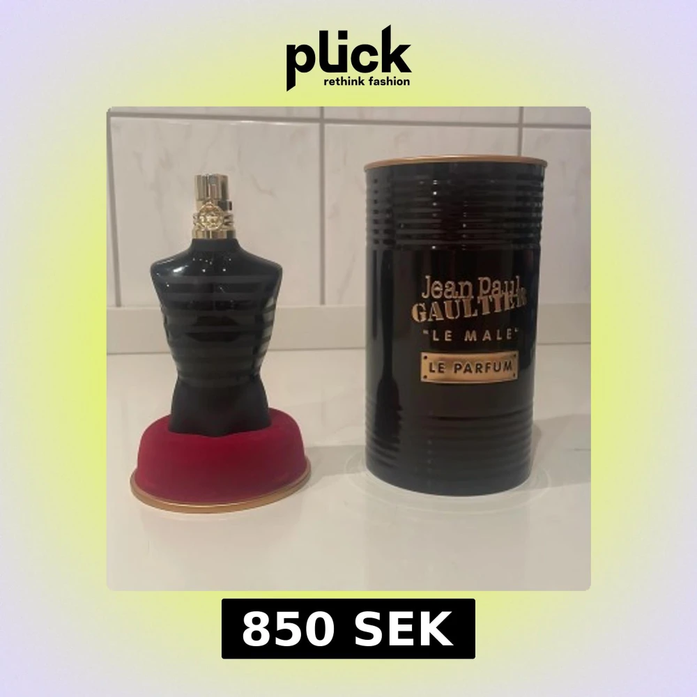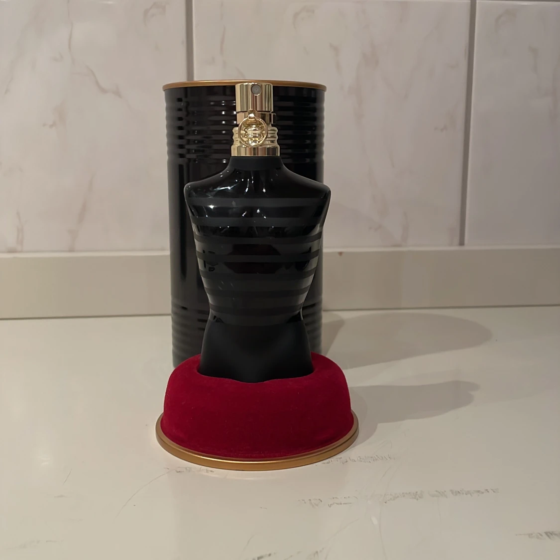 Säljer en elegant parfymflaska formad som en manlig torso i svart glas med gulddetaljer. Flaskan står på en röd bas och kommer med en stilren svart metallförpackning. Doften är intensiv och maskulin, perfekt för den som vill sticka ut. Det finns ungefär kvar 70ml i flaskan utav 75ml.