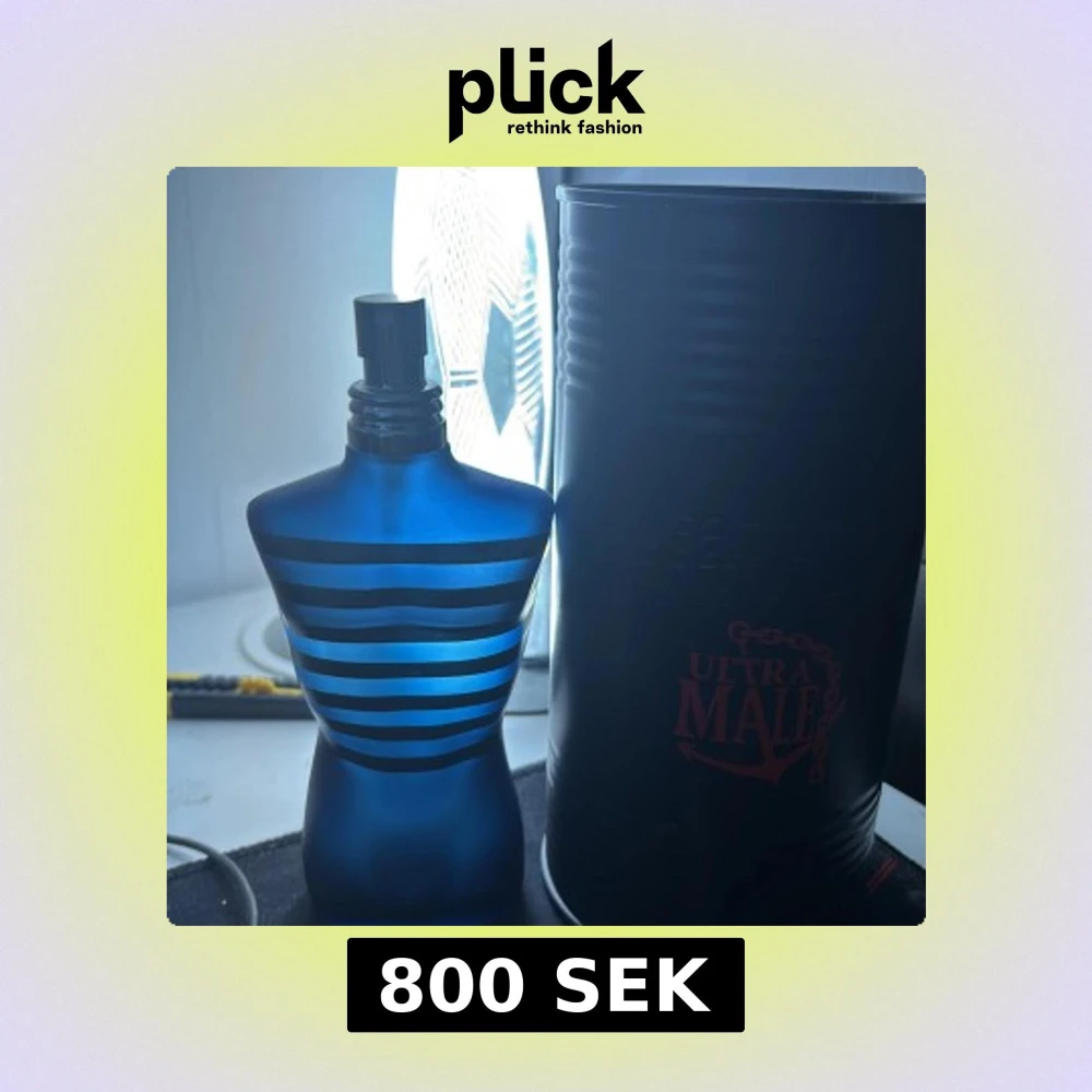 Säljer en Jean Paul Gaultier Ultra Male parfym i den ikoniska blå flaskan med svarta ränder, formad som en manlig torso. Kommer i original metalltub. Doften är intensiv och maskulin, perfekt för dig som gillar unika och kraftfulla parfymer. 125 ml. Pris kan diskuteras