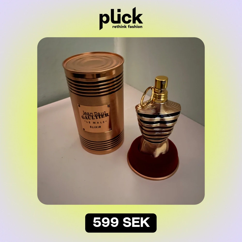 Snygg parfymflaska i form av en manlig torso från Jean Paul Gaultier. Flaskan är guld- och svartfärgad med horisontella ränder och en elegant design. Perfekt för den som vill ha en unik och stilfull doftupplevelse.