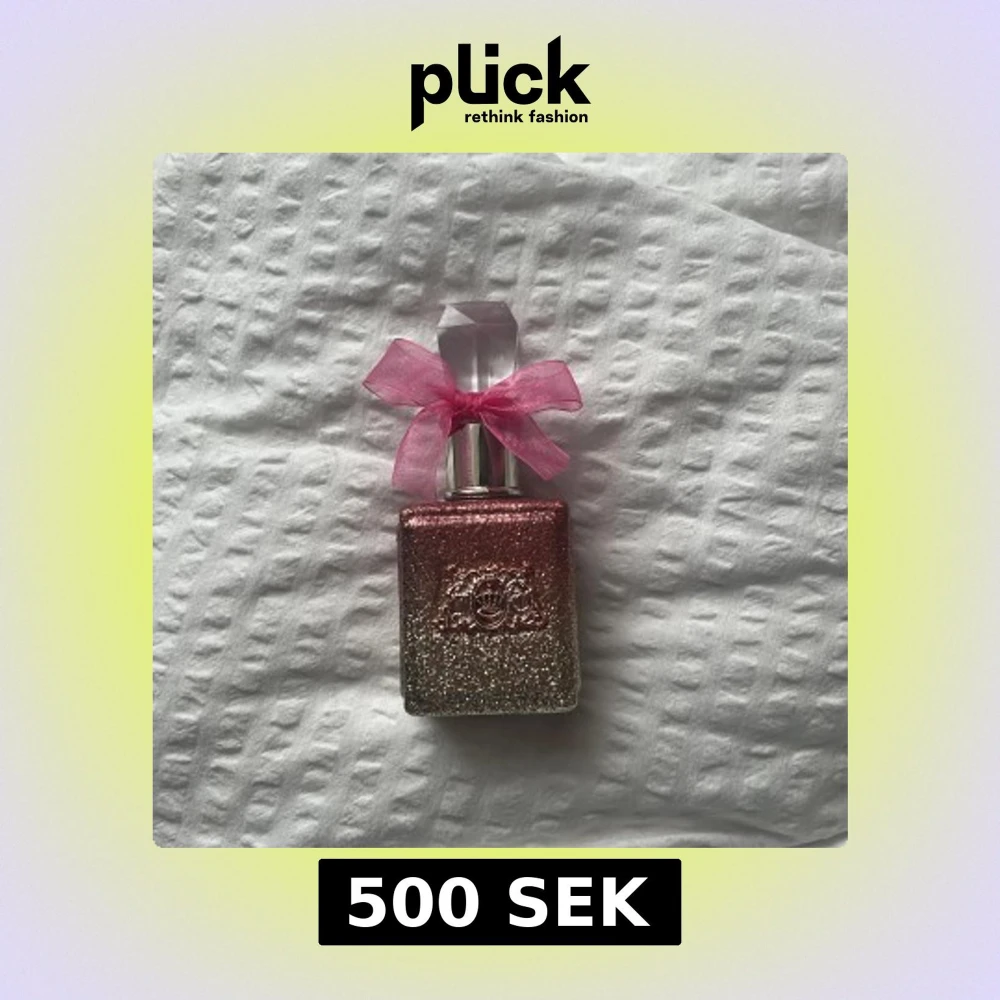 Superfin parfymflaska från Juicy Couture med massor av rosa och silvrigt glitter. Flaskan har en fyrkantig form, ett stort kristalliknande lock och en söt rosa rosett runt halsen. Perfekt som present eller till din egen samling!