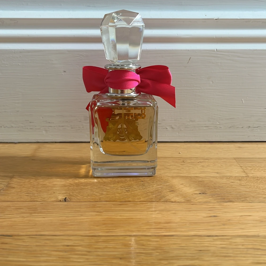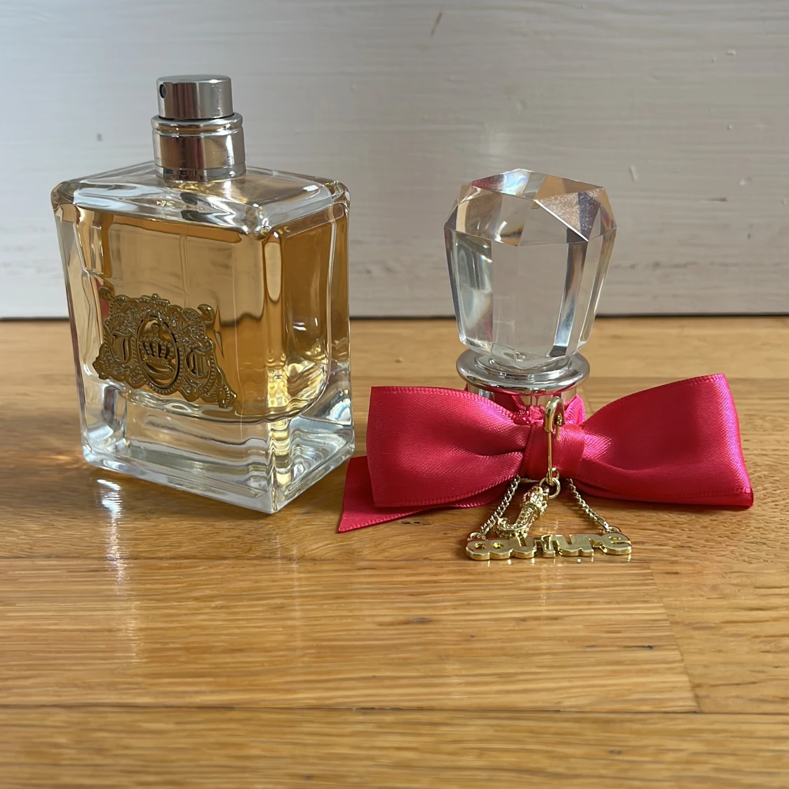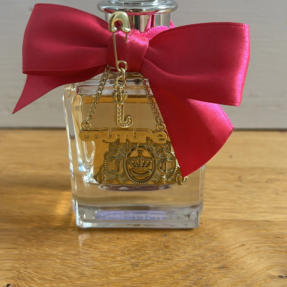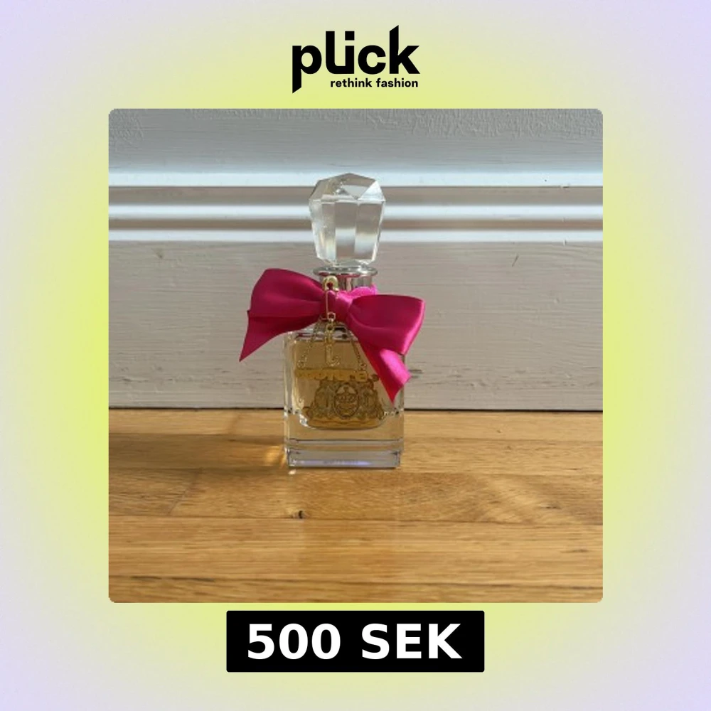 Juicy Couture parfym i en lyxig, fyrkantig glasflaska med guldfärgad logga och detaljer. Flaskan har en stor, kristalliknande kork och dekoreras med en rosa satinrosett och guldfärgad 'Couture'-berlock. Perfekt för dig som gillar glam och statement-detaljer.