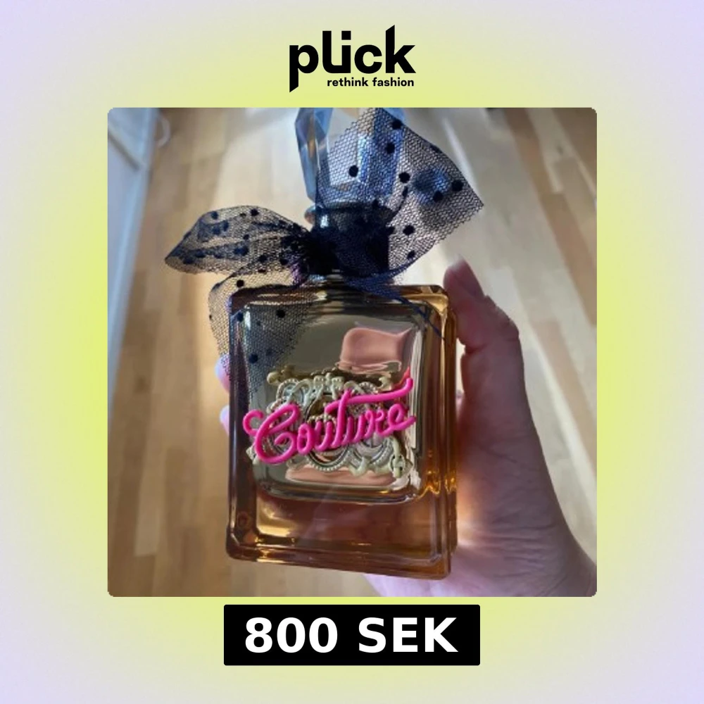 Säljer en lyxig parfym från Juicy Couture i en fyrkantig, bärnstensfärgad flaska med dekorativ svart prickig rosett och guldiga detaljer. Framsidan har en rosa Couture-logga i 3D. Perfekt för dig som gillar snygga och unika flaskor. Oanvänd