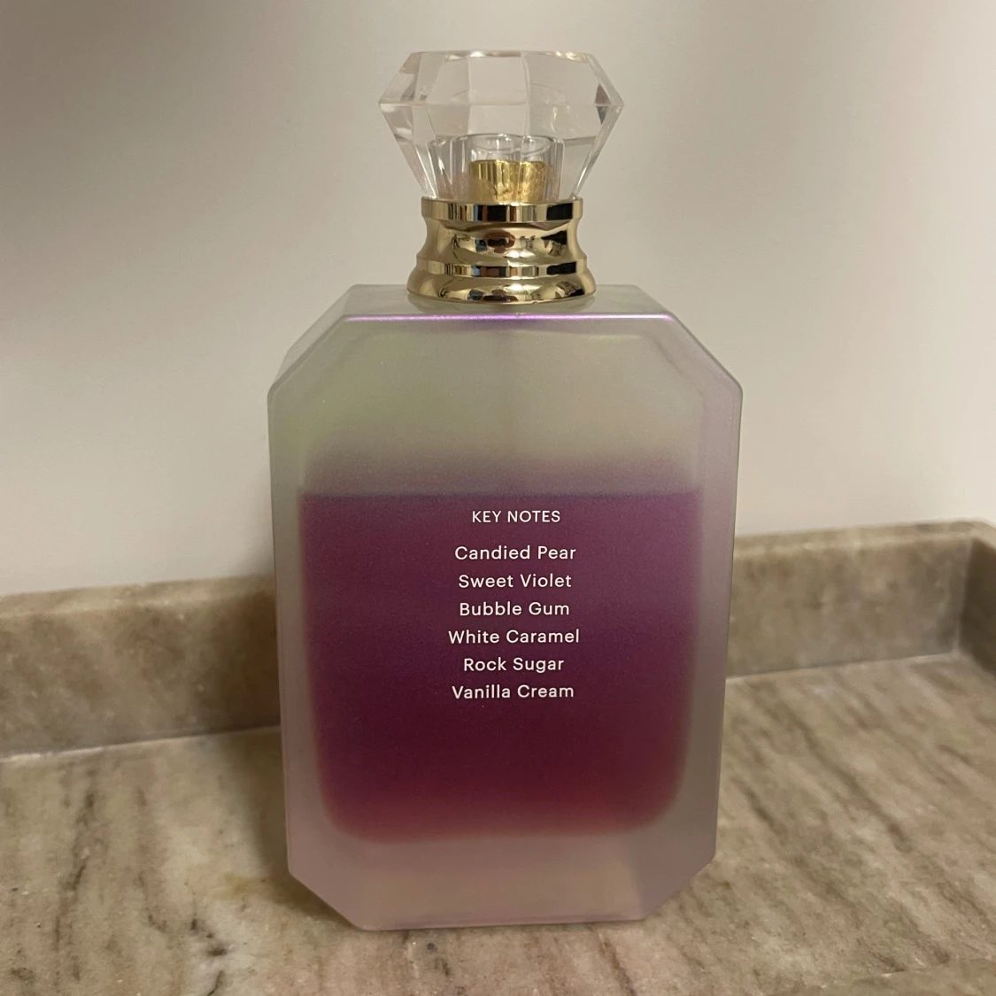 Söt och lekfull parfym med noter av sockrad päron, söt viol, bubbelgum, vit kola, sockerkristall och vaniljkräm. Volym: 100 ml. Skulle säga att ca 80 ml är kvar av den. 🌸💕nypris: 1389kr