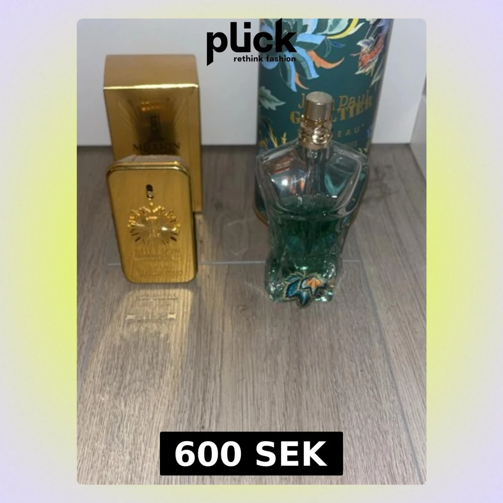 Två ikoniska herrparfymer: Paco Rabanne 1 Million i en guldig, rektangulär metallflaska med matchande förpackning och Jean Paul Gaultier Le Male i en turkos, kroppformad glasflaska med dekorativ förpackning. Båda dofterna är populära och har unika, lyxiga designer. Ungefär hälften kvar i båda