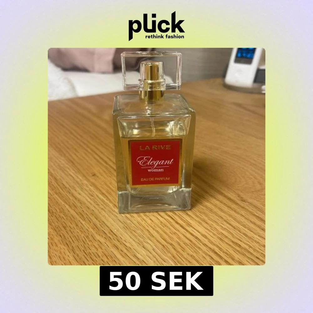 En stilren parfym för kvinnor från La Rive, Elegant Woman Eau de Parfum. Flaskan är rektangulär i genomskinligt glas med en guldig spray och ett fyrkantigt lock. Etiketten är röd med guldtext.