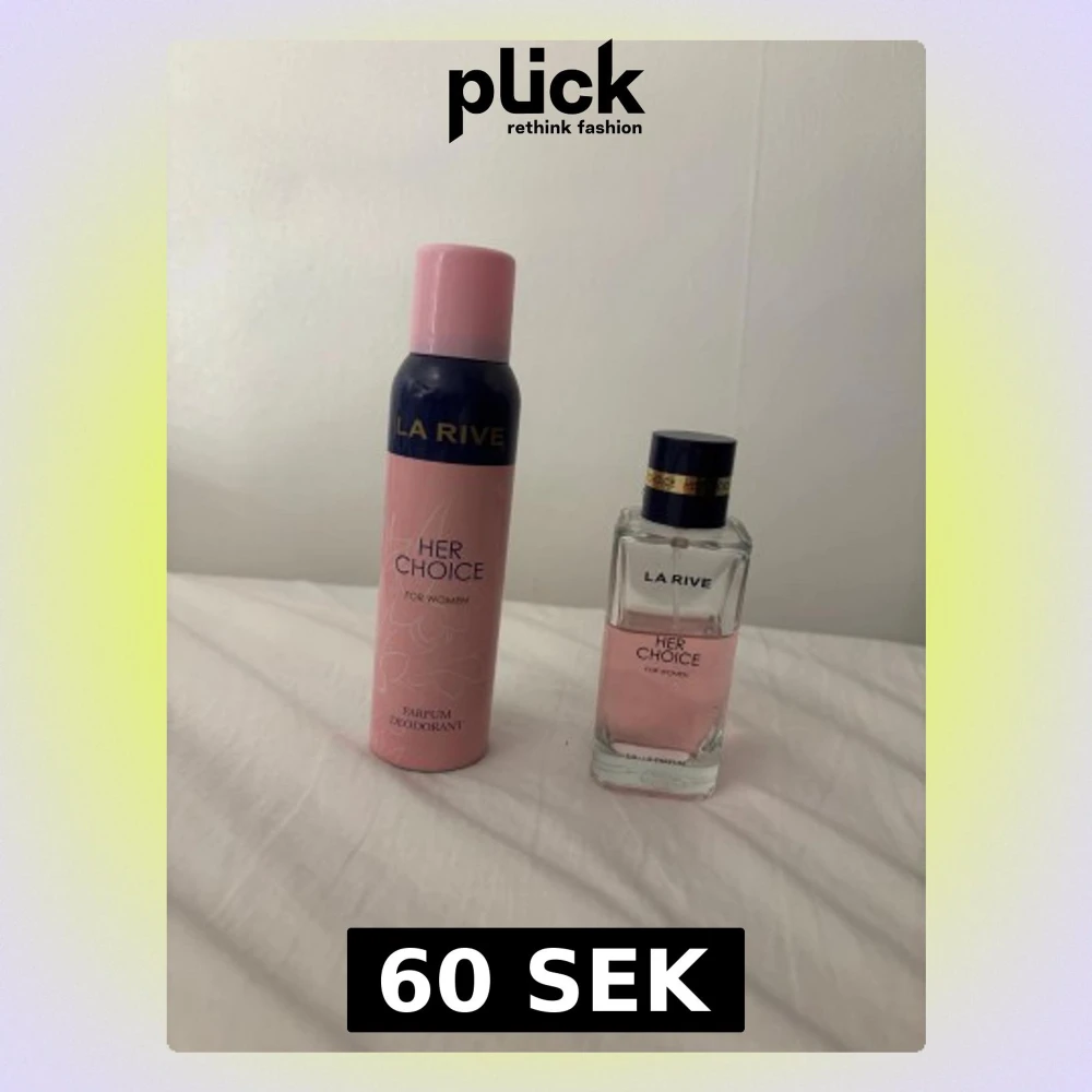 La Rive Her Choice for Women – ett set med både parfymdeodorant och eau de parfum. Perfekt för dig som vill ha en fräsch och feminin touch i vardagen. Den är använd men har ganska mycket produkt i sig men därför säljer jag för billigt pris.