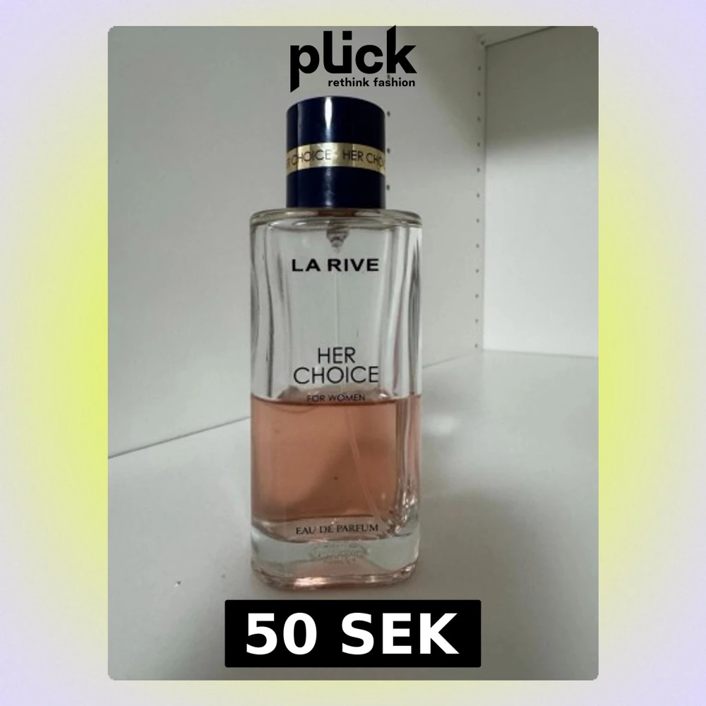 La Rive Her Choice Eau de Parfum för kvinnor i en elegant, fyrkantig glasflaska med ljusrosa doftvätska. Flaskan har en mörkblå kork med gulddetaljer och tydlig märkning på framsidan. Perfekt för dig som gillar fräscha och feminina dofter.