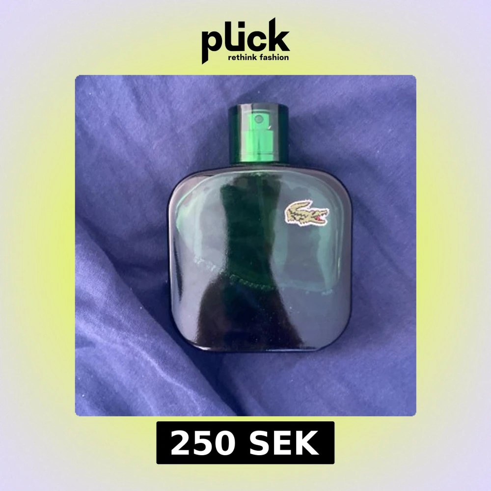 Grön, fyrkantig parfymflaska från Lacoste med den klassiska krokodilloggan på framsidan. Flaskan rymmer 100 ml Eau de Toilette och har en stilren, modern design i glas med grön plastkork. Perfekt för dig som gillar fräscha och sportiga dofter.