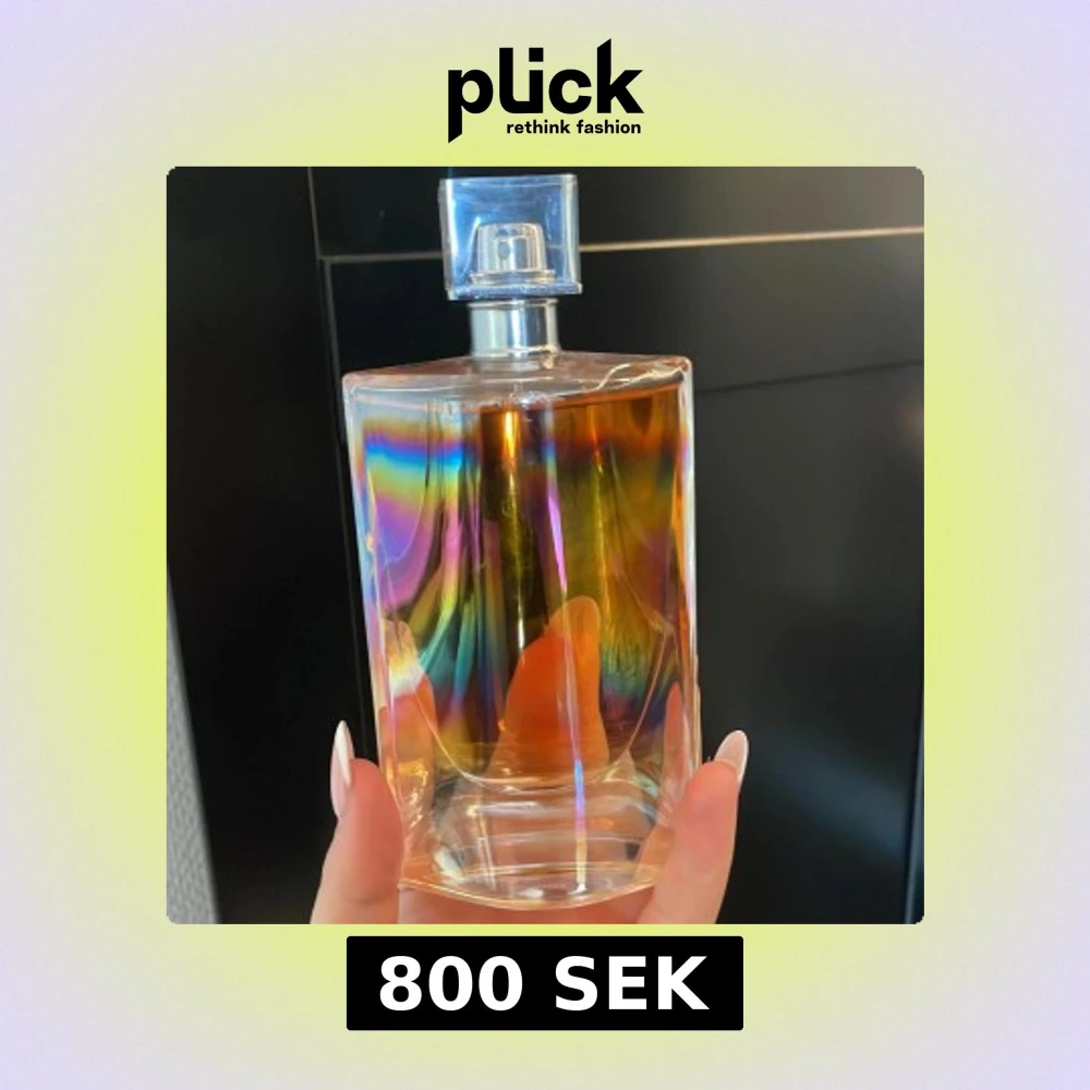 Säljer en stor parfymflaska från Lancome med ett unikt regnbågsskimrande glas. Flaskan har en fyrkantig, transparent kork och en elegant, rektangulär form. Perfekt för dig som gillar snygg design och vill ha något som sticker ut i parfymhyllan.