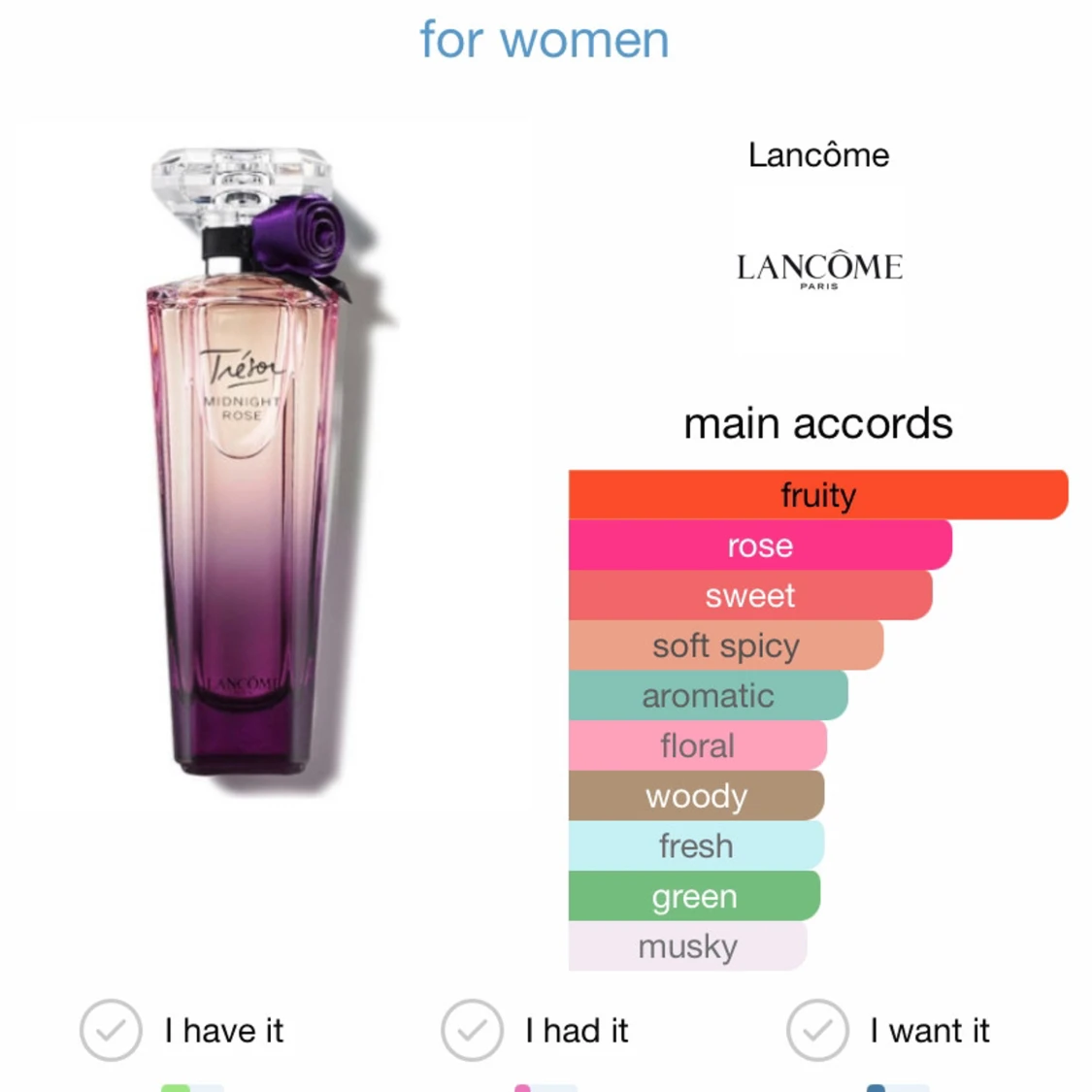 En elegant parfym från Lancôme med en lila-rosa glasflaska och dekorativ ros vid halsen. Doften har fruktiga och blommiga toner av hallon och ros, med inslag av svarta vinbär, rosépeppar, pion, jasmin, vanilj, mysk och cederträ.