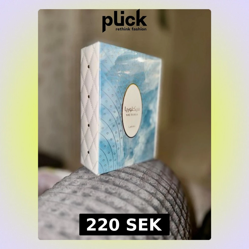 Snygg parfym från Lattafa i en elegant blå och vit förpackning med quiltad struktur på sidorna och gulddetaljer runt etiketten. Doften heter Victoria och boxen har ett modernt, lyxigt utseende som sticker ut i badrumshyllan.
