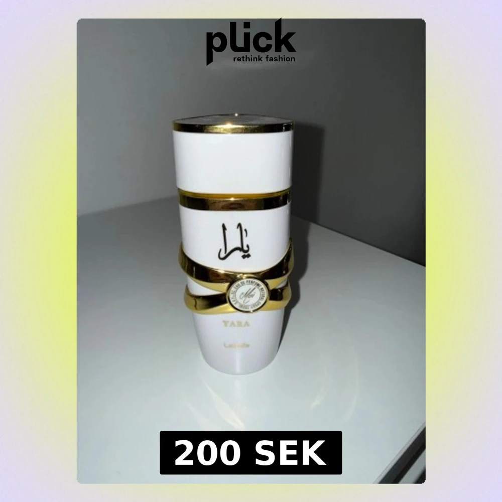 Snygg parfymflaska från Lattafa i modellen Yara. Flaskan är vit med eleganta gulddetaljer och har en unik, staplad design. Dekorerad med arabiska bokstäver och en rund guldetikett. Perfekt för dig som gillar exklusiva dofter och stilren design.