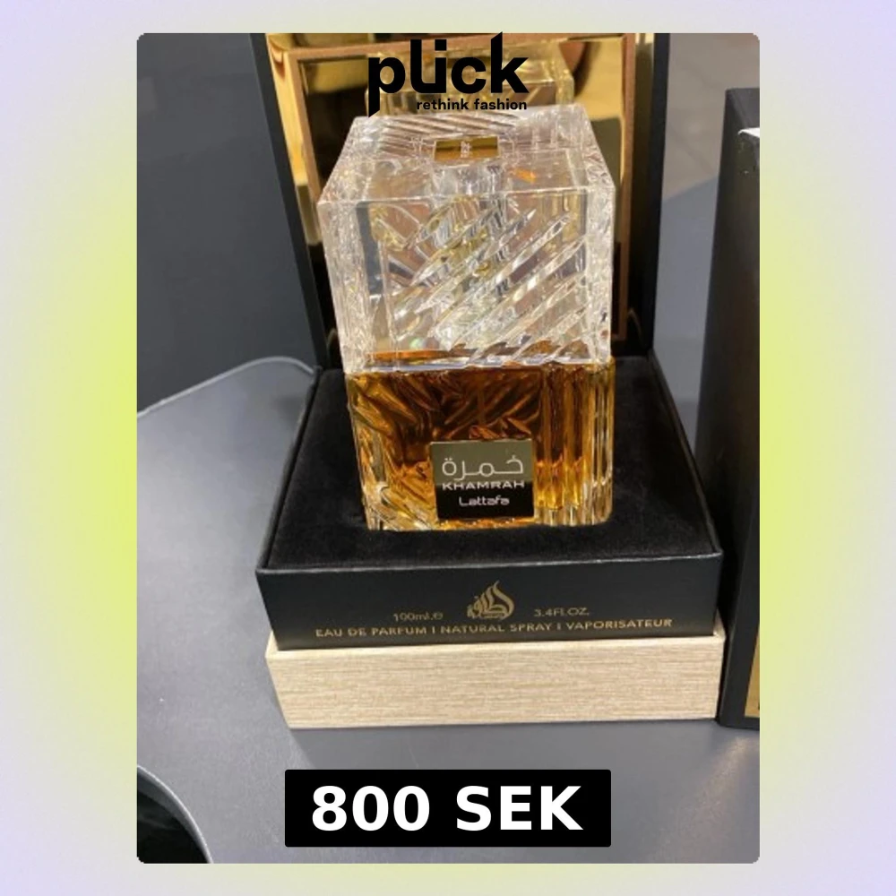 Lattafa Khamrah Eau de Parfum i en lyxig, fyrkantig glasflaska med guldbrun vätska och elegant mönstrad kork. Flaskan har en exklusiv känsla med gulddetaljer och levereras i en svart och guldig förpackning. Perfekt för dig som gillar unika dofter.