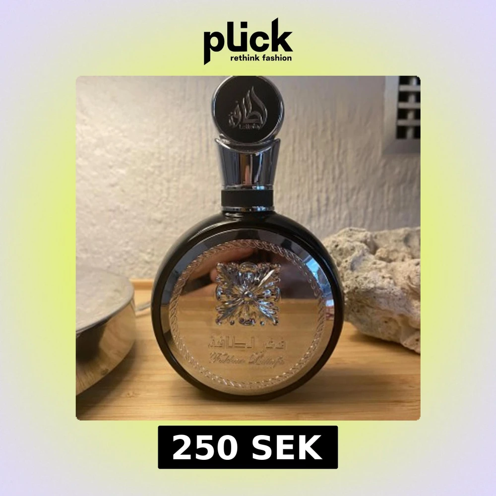 Elegant parfymflaska från Lattafa med en rund form och en lyxig silverfärgad etikett. 70ml kvar! Flaskan har en dekorativ design med ett detaljerat mönster och en stilren kork. Perfekt för den som söker en exklusiv doftupplevelse.