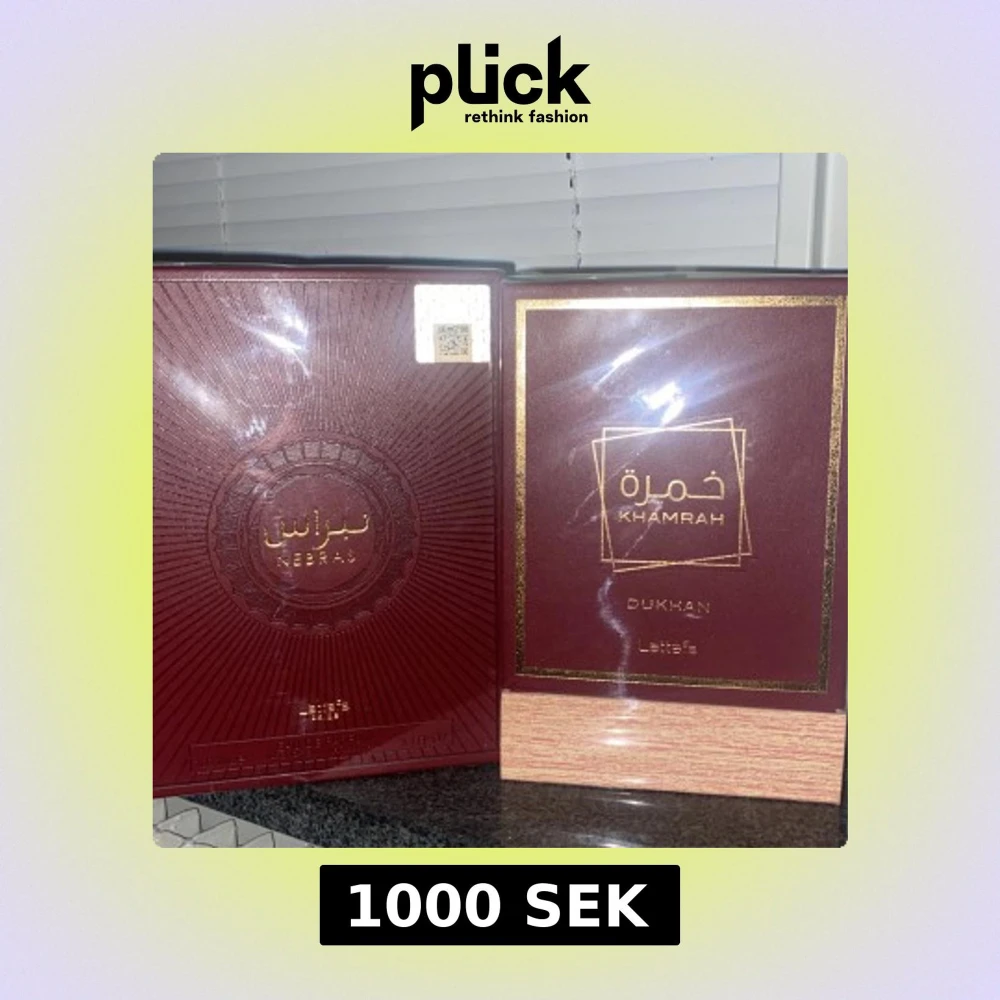 Två exklusiva parfymer från Lattafa: Nebras och Khamrah Dukhan. Båda kommer i lyxiga vinröda förpackningar med gulddetaljer och elegant design. Perfekt för dig som gillar orientaliska dofter och snygga flaskor att ha på hyllan.