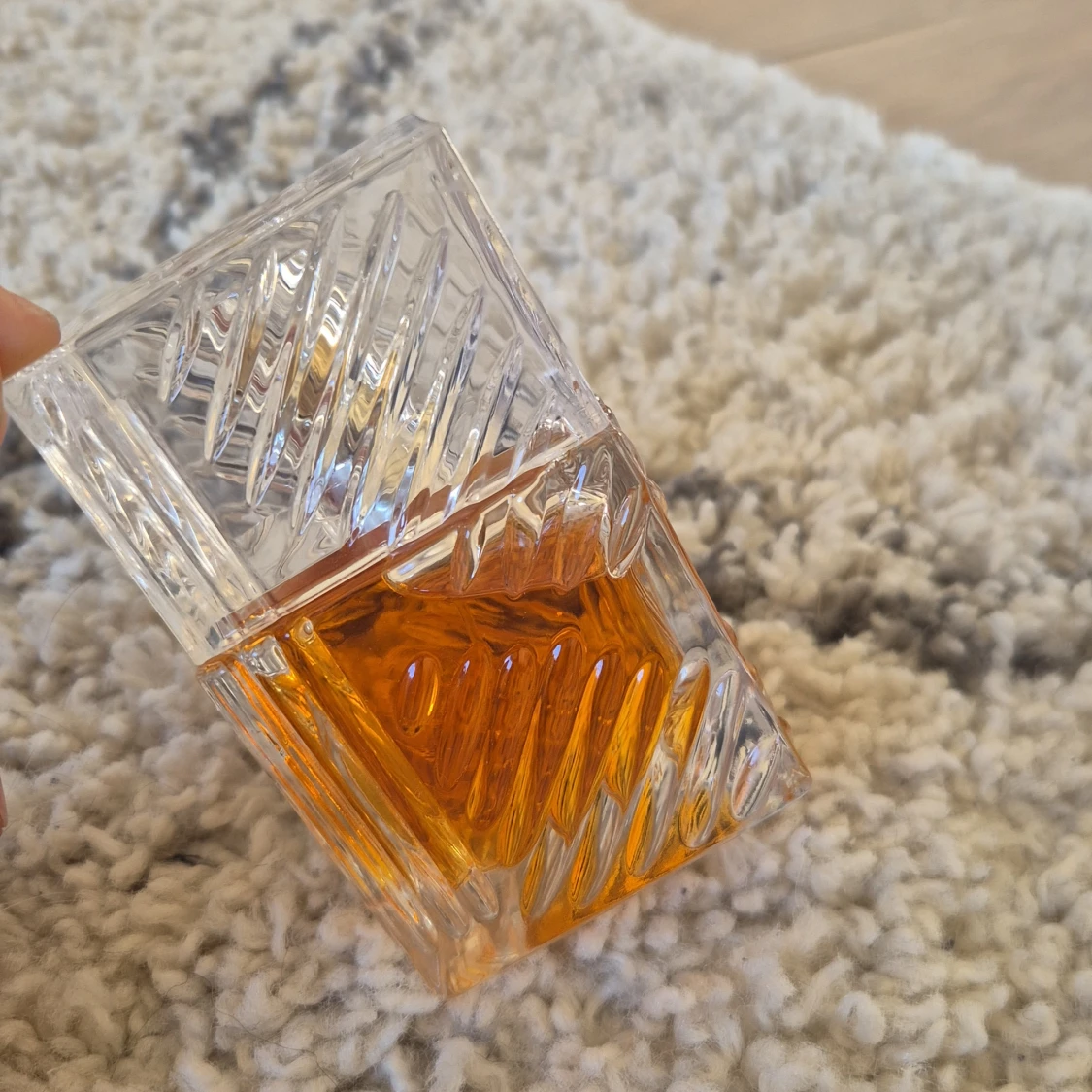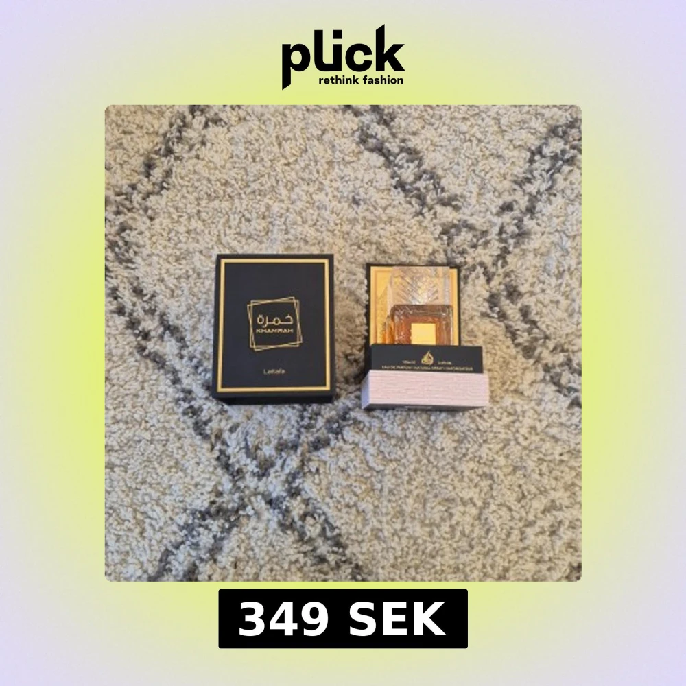 Khamrah Eau de Parfum från Lattafa i en lyxig, fyrkantig glasflaska med tydliga snidade mönster och transparent lock. Ungefär 97/100 ml kvar