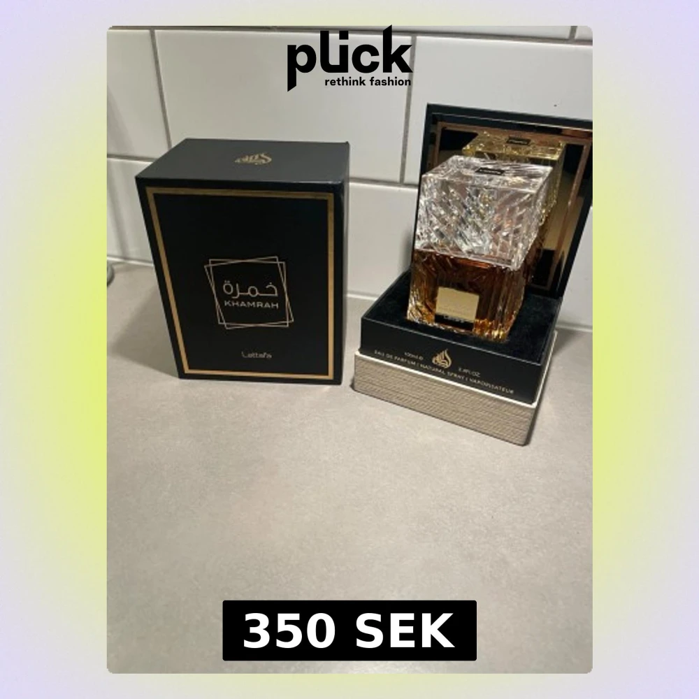 Exklusiv parfym från Lattafa, Khamrah, i en lyxig glasflaska med mönstrad design och guldiga detaljer. Flaskan har en fyrkantig form och innehållet är bärnstensfärgat. Levereras i elegant svart och guldig förpackning.