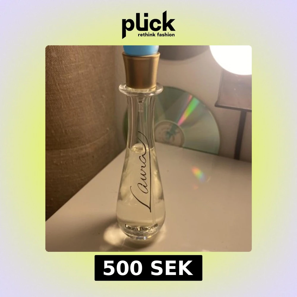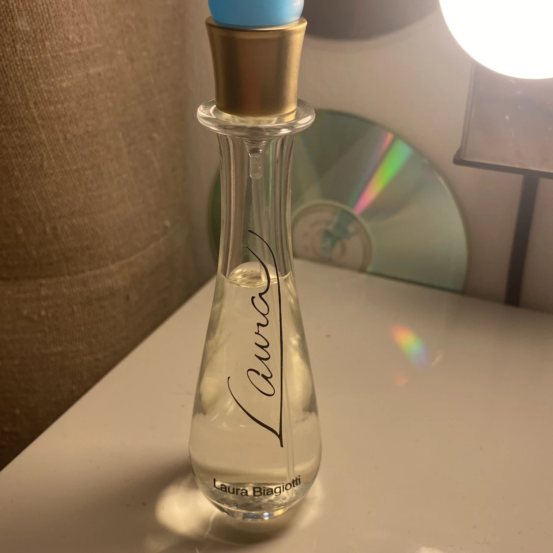 Elegant parfymflaska från Laura Biagiotti med genomskinligt glas, smal midja och bredare botten. Flaskans kork är guldig med en blå topp, och texten 'Laura' är tryckt i svart på framsidan. Perfekt för dig som gillar stilrena dofter.