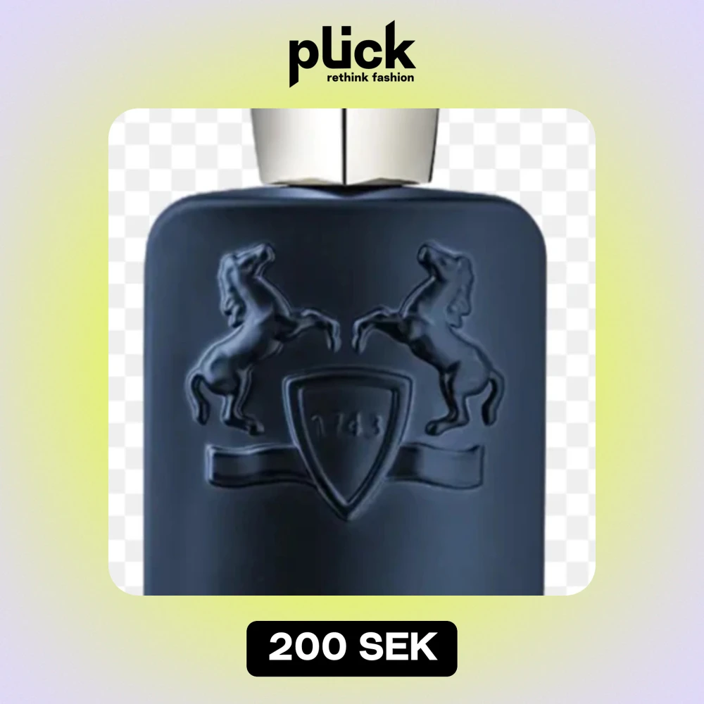 Parfums de Marly Layton - Säljer en elegant parfym från Parfums de Marly, Layton. Flaskan är mörkblå med en stilren design och har en silverfärgad kork. Förpackningen är svart med vita ränder och har en kunglig känsla med hästmotiv. Perfekt för den som vill ha en lyxig doftupplevelse.