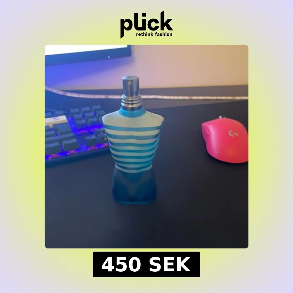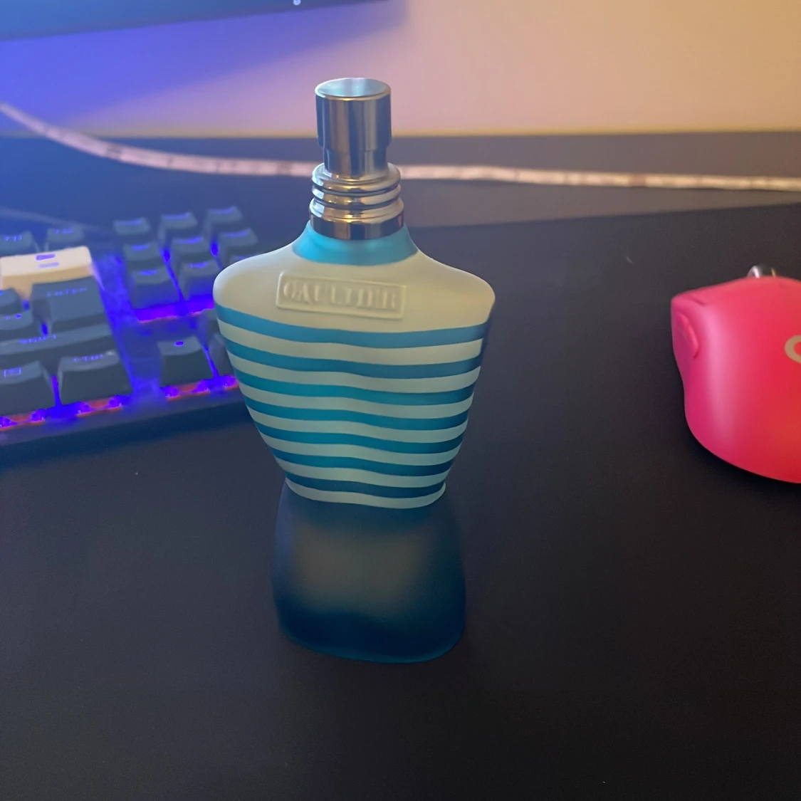 Ikonisk parfymflaska formad som en manlig torso med blå och turkosa ränder. Denna doft är känd för sin fräscha och sensuella karaktär, perfekt för den självsäkra mannen. Flaskan är både stilren och unik, vilket gör den till ett samlarobjekt.