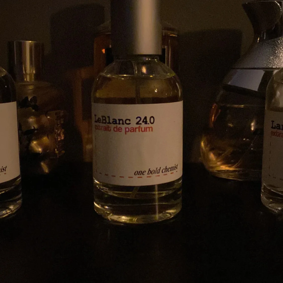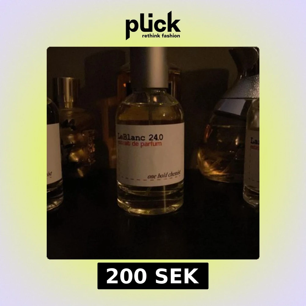 Elegant och sofistikerad parfym från LeBlanc med en minimalistisk design. Flaskan är genomskinlig med en enkel vit etikett och svart text. Perfekt för den som söker en unik doftupplevelse.