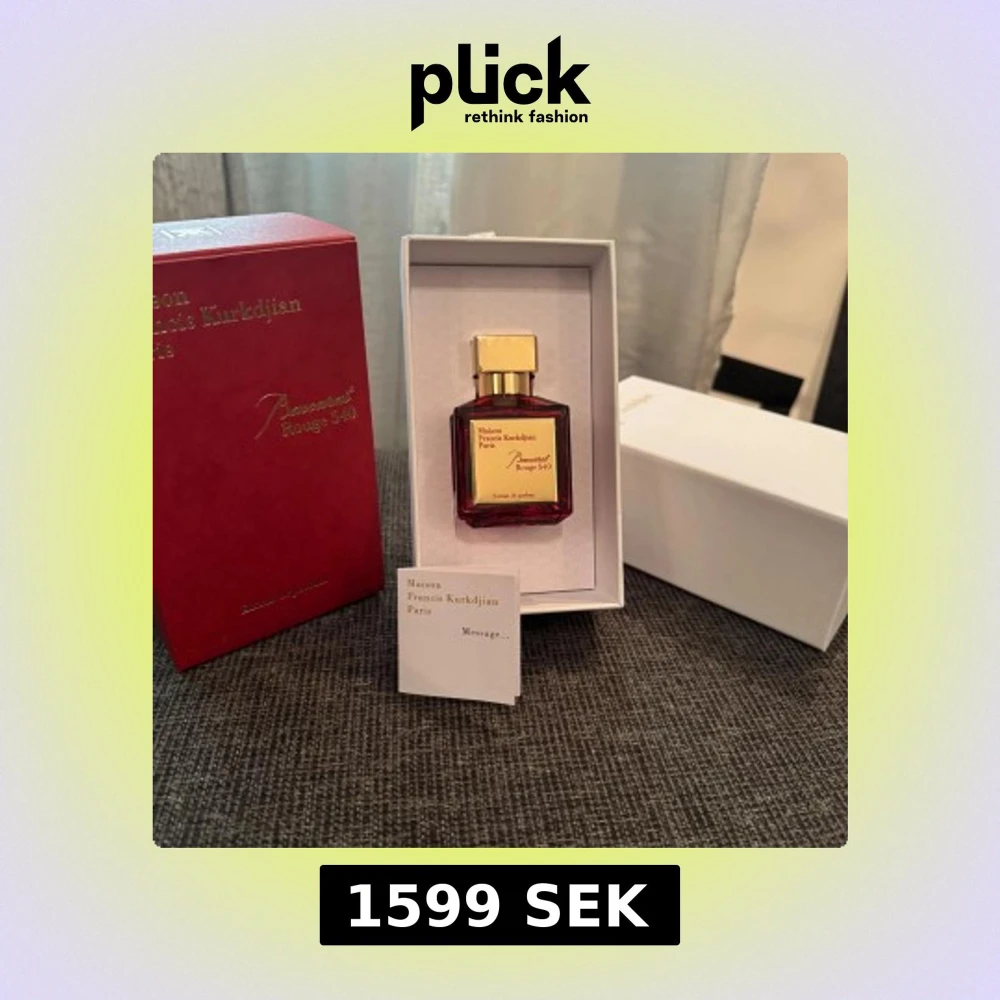 Exklusiv parfym från Maison Francis Kurkdjian, Baccarat Rouge 540. Flaskan är elegant i röd glas med en gyllene kork och etikett. Den kommer i en lyxig förpackning som utstrålar sofistikation och stil.