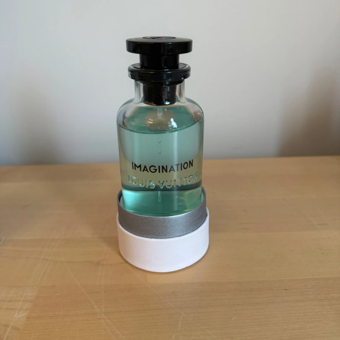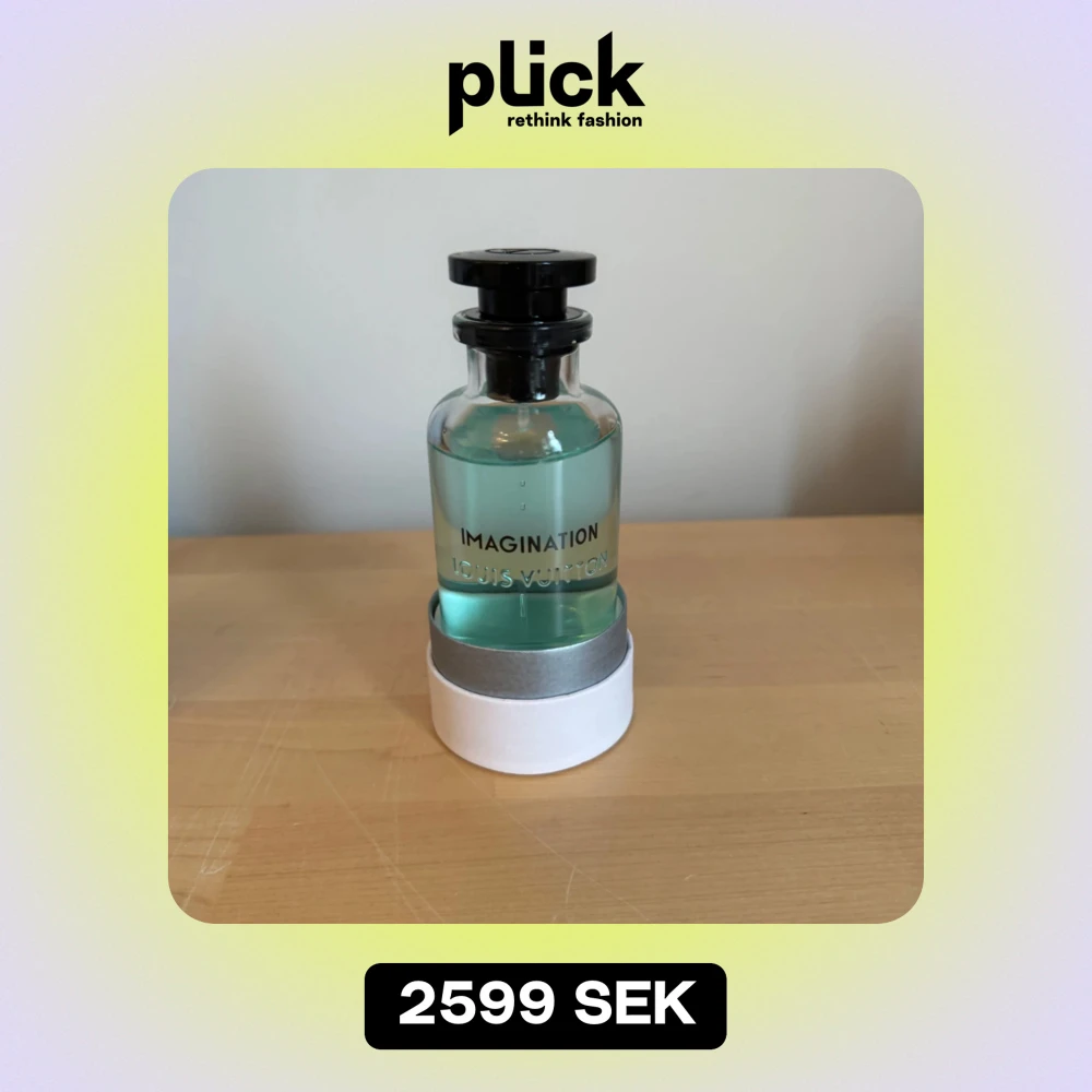 Säljer en elegant parfymflaska från Louis Vuitton, doften heter Imagination. Flaskan är genomskinlig med en ljusblå vätska och har en stilren svart kork. Den kommer i en vit, cylindrisk förpackning med märkets logga. Perfekt för den som vill ha en lyxig doftupplevelse! Finns ungefär 96ml kvar och box och kvitto medföljer. Kvitto visas endast för den som köper parfymen så fråga inte efter