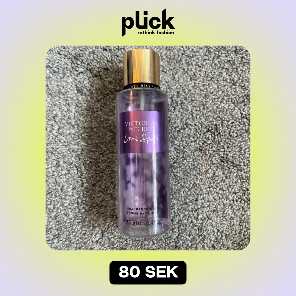 Säljer en Love Spell Fragrance Mist från Victoria's Secret. Flaskan är lila med en guldig kork och rymmer 250 ml. Doften är en mix av körsbärsblom, färsk persika och en touch av mystik. Perfekt för att fräscha upp sig med en söt och fruktig doft! Det är hälften kvar ungefär därav priset.💕