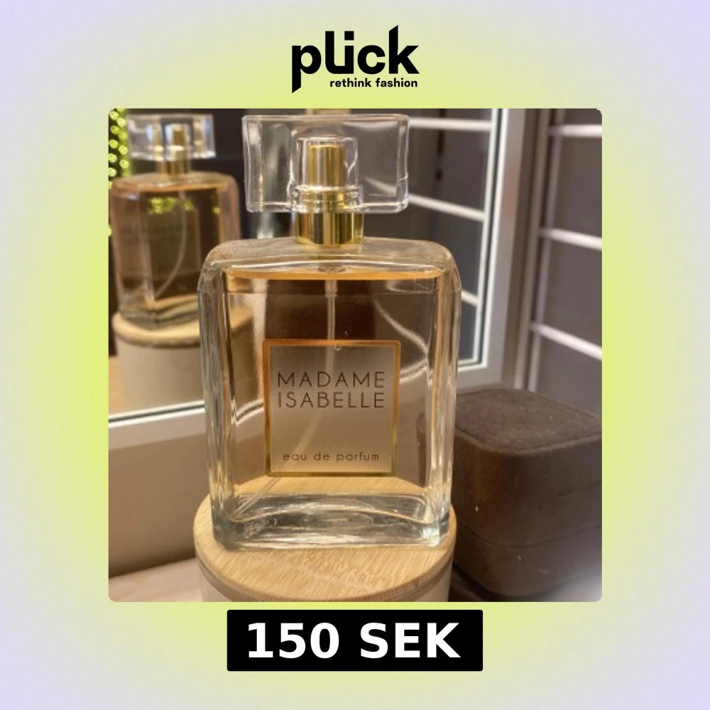 Elegant parfymflaska i genomskinligt glas med guldiga detaljer och en fyrkantig transparent kork. Innehållet är en ljusrosa vätska. Flaskan har en stilren etikett med texten 'Madame Isabelle eau de parfum'. Perfekt för dig som gillar klassiska och feminina dofter.