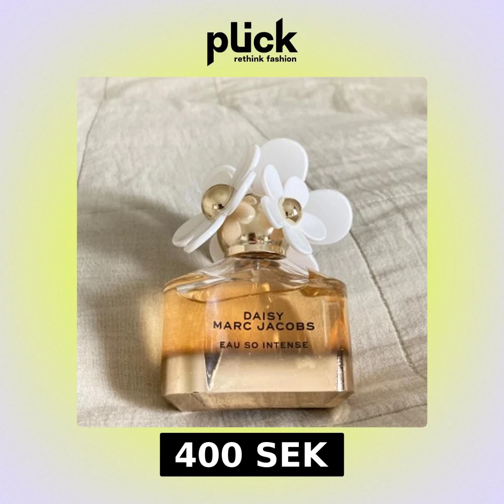 Säljer en Daisy Eau So Intense parfym från Marc Jacobs. Flaskan är guldig med en transparent nedre del och har ett unikt lock dekorerat med vita och guldiga blommor. Doften är fräsch och blommig, perfekt för dig som gillar eleganta parfymer.