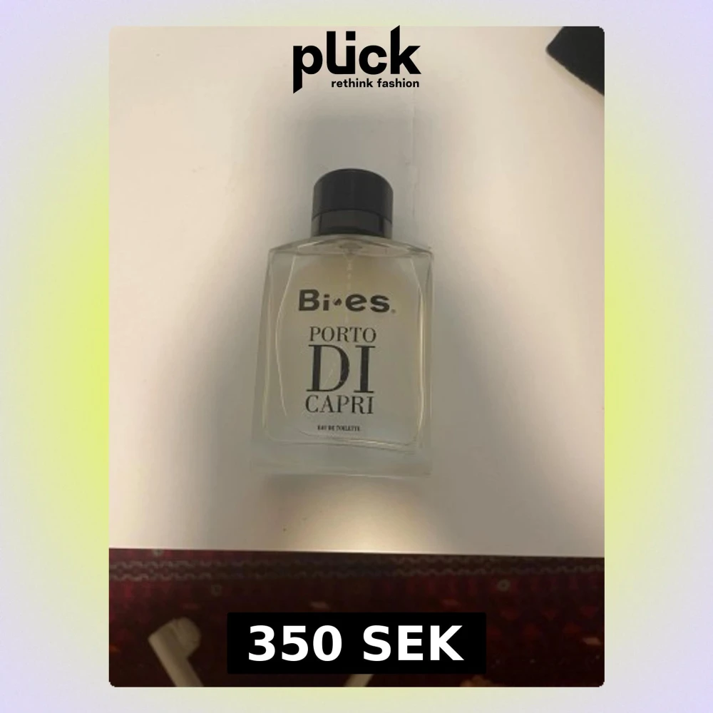 Fräsch parfym från Bi-es, Porto Di Capri, i en stilren, transparent glasflaska med svart lock och sprayfunktion. Flaskan har en modern, fyrkantig form och tydlig svart text på framsidan. Perfekt för dig som gillar klassiska och eleganta dofter.