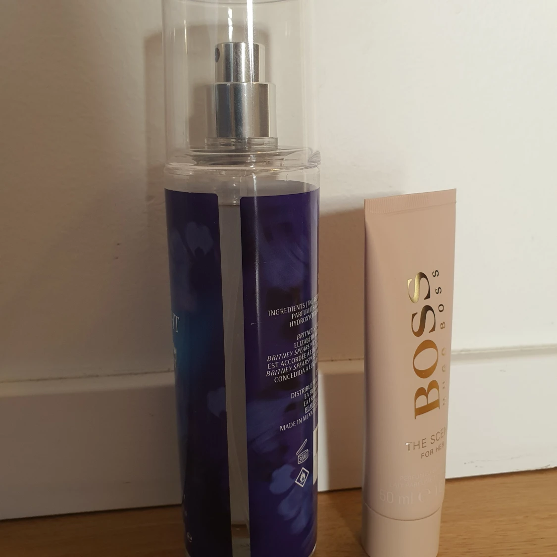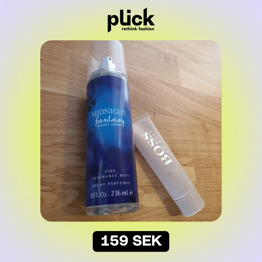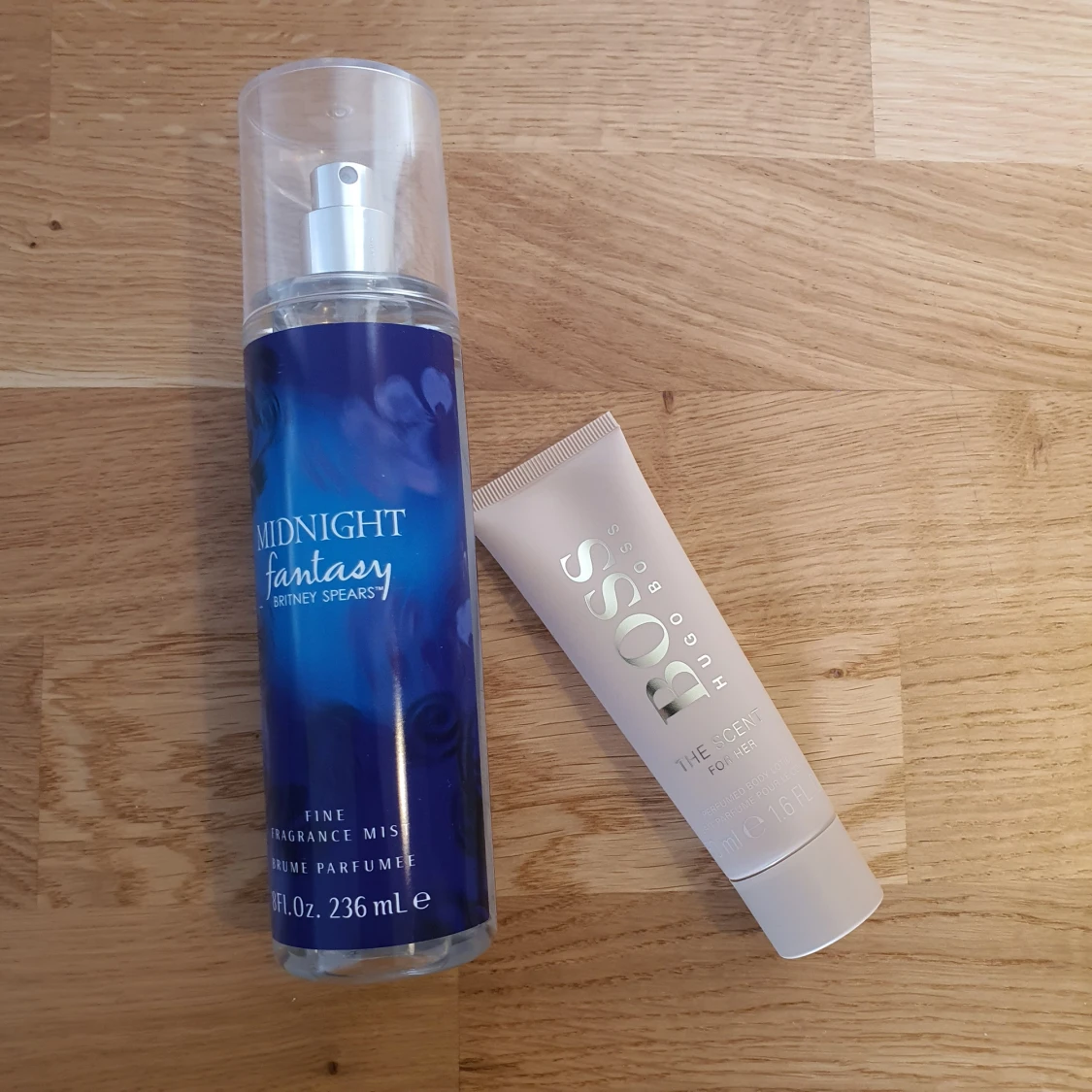 Body spray Midnight Fantasy av Britney Spears i en blå sprayflaska på 236 ml, perfekt för en mystisk och fruktig doft. Oöppnad Bodylotion Boss The Scent 50ml i en elegant beige tub, idealisk för en sofistikerad och sensuell doftupplevelse.