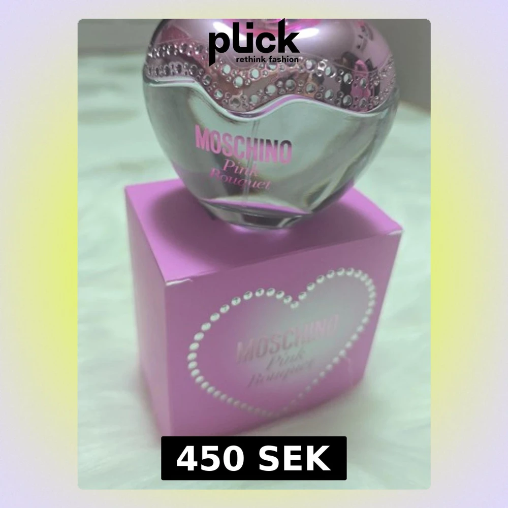 Moschino Pink Bouquet parfym i en hjärtformad flaska med silver- och rosa detaljer samt glittrande dekorationer. Flaskan står på en rosa kartong med pärlformad hjärtdesign. Perfekt för dig som gillar söta och lekfulla dofter.