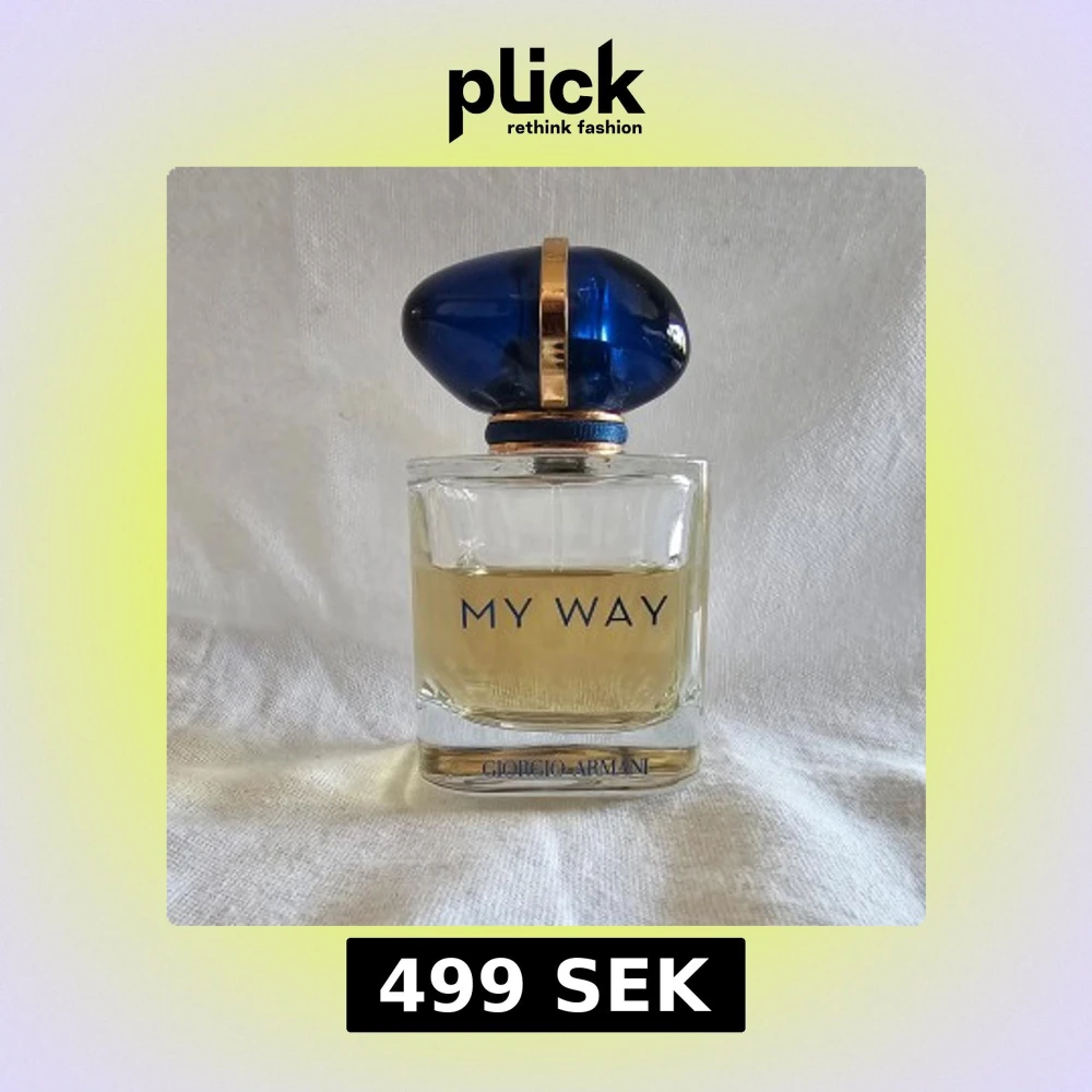 Elegant parfymflaska med en klar glasdesign och en djupblå, oval kork med gulddetaljer. Doften 'My Way' från Giorgio Armani är en Eau de Parfum, perfekt för den som söker en sofistikerad och modern doftupplevelse. Det är ca 40ml kvar i flaskan. Om ni har några funderingar så är det bara att fråga.