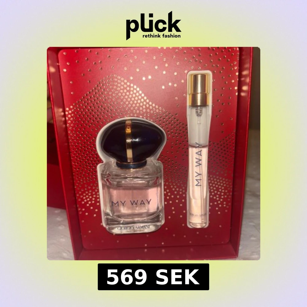 Exklusivt parfymset med My Way från Giorgio Armani. Innehåller en elegant glasflaska med mörkblått och guldigt lock samt en smidig resestorlek med guldlock. Båda flaskorna har en ljusrosa doftvätska och levereras i en lyxig röd presentask. Den stora är 50ml❤️