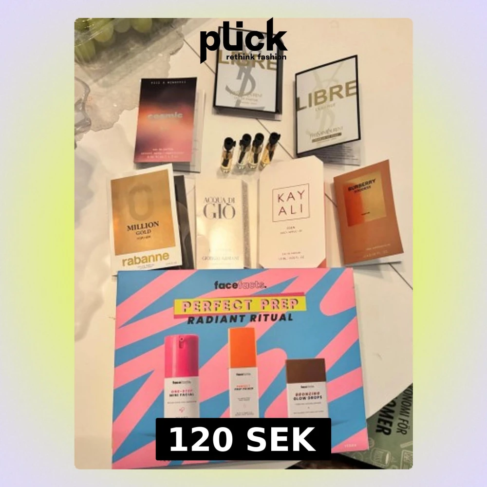 Säljer i paket ett hudvårdskit med primer, ansiktsmask och bronzing drops 🤎 samt 7 parfymtester enligt bild (2 olika libre) och 4 testers från Essnce parfym i dofterna oh darling, milky flower, sweet cara och noble eclat 🤍 dofterna från Essnce är testade resten oanvänt ❣️