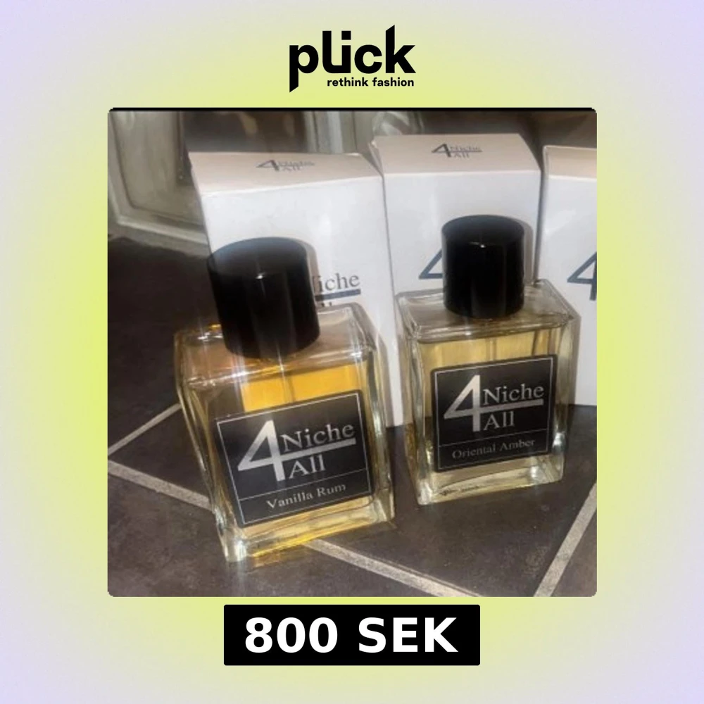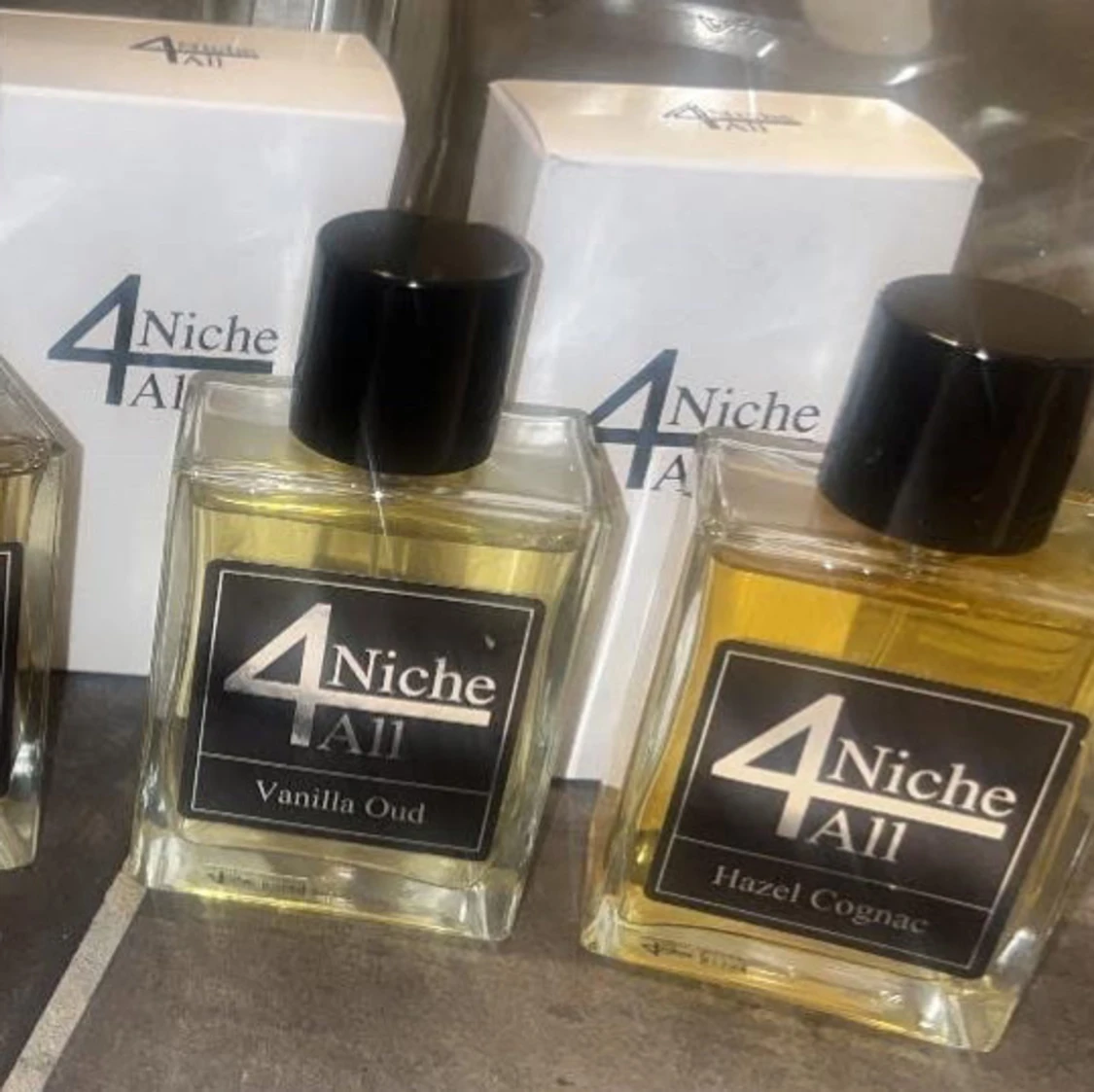 4 100 ML. Upptäck en exklusiv parfymkollektion från 4 Niche All med dofterna Vanilla Rum, Oriental Amber, Vanilla Oud och Hazel Cognac. Flaskorna har en elegant fyrkantig design med svarta lock och etiketter. Perfekt för den som vill ha en unik doftupplevelse. Inspirerade av Parfums de Marley layton, Intitio Side Effect, Xerjoff Alexandria 2, Killian angel share. Pris diskuteras i Meddelande 800Kr styck. Än så länge.
