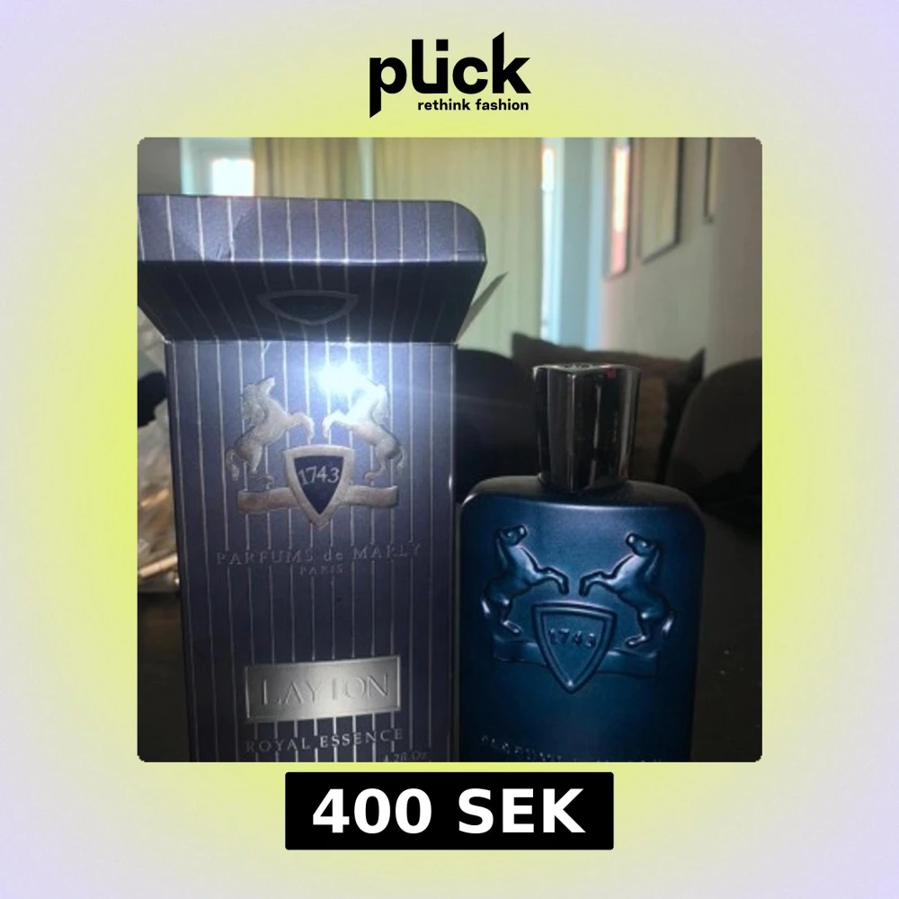 Lyxig parfym från Parfums de Marly, modellen Layton Royal Essence. Flaskan är mörkblå med silverdetaljer och har en stilren, maskulin design med två upphöjda hästar och sköld på framsidan. Kommer i originalkartong med samma eleganta mönster.