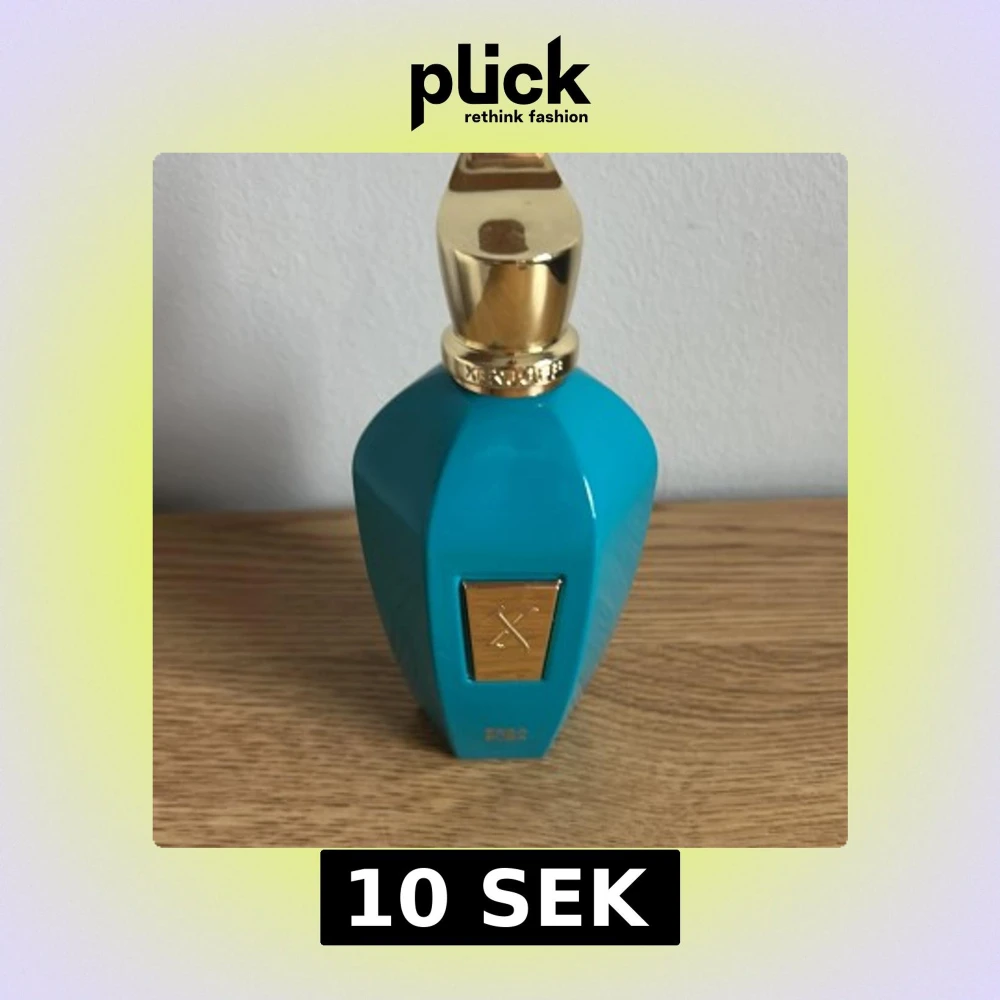 Exklusiv parfym från Xerjoff i en turkos flaska med gulddetaljer och elegant lock. Flaskan har en geometrisk form och en metallplatta framtill med märkets logotyp. Perfekt för dig som gillar lyxiga dofter och snygg design.