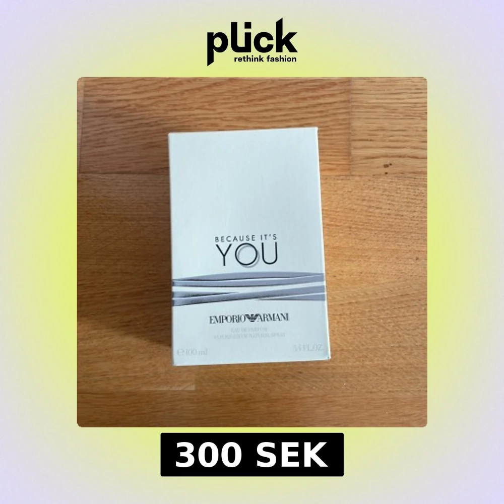 Säljer en elegant parfymflaska av Emporio Armani, 'Because It's You'. Flaskan är genomskinlig med en silverfärgad kork och rymmer 100 ml av en varm, bärnstensfärgad doft. Förpackningen är stilren och vit med subtila grå detaljer. Perfekt för den som vill ha en sofistikerad och modern doft.