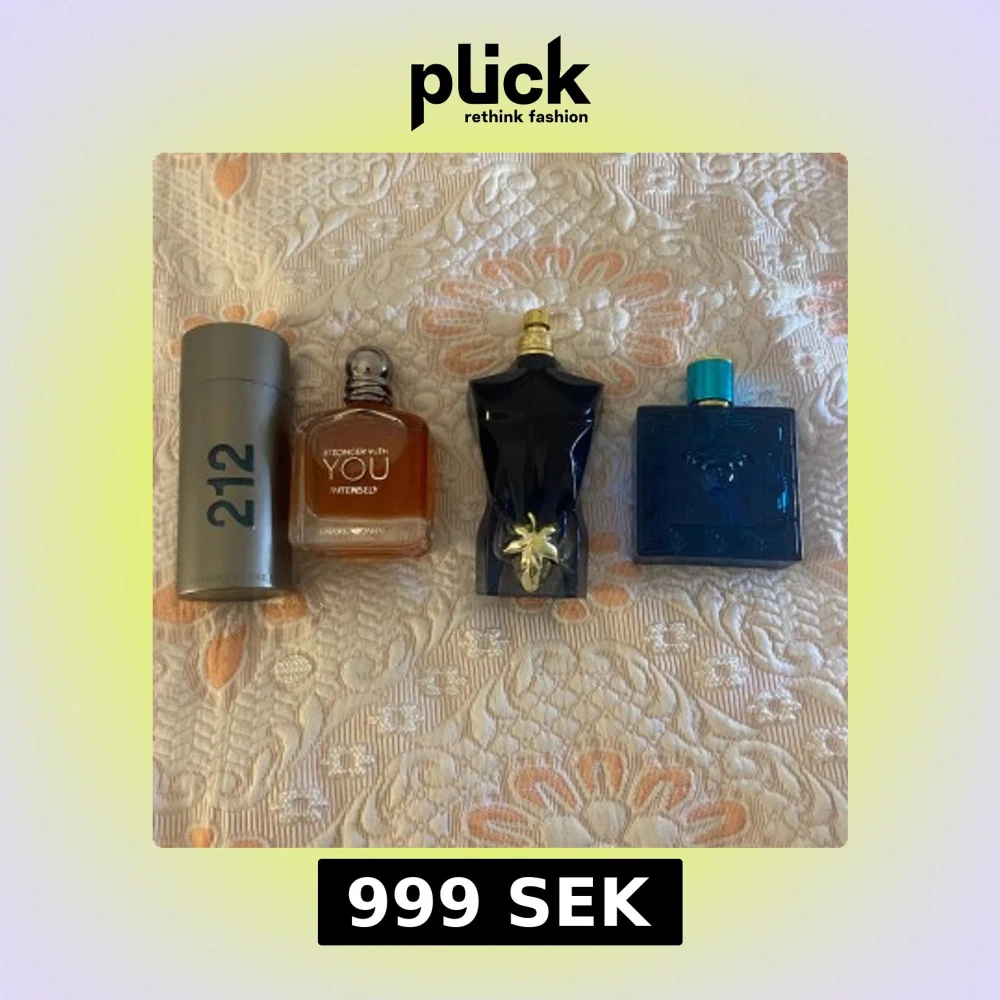 Säljer fyra snygga herrparfymer: 212 i silverfärgad cylinder, Stronger With You Intensely i fyrkantig glasflaska med bärnstensfärgad vätska, Le Male i mörkblå kroppformad flaska med gulddetalj och Versace Eros i blå kvadratisk flaska med turkos kork.